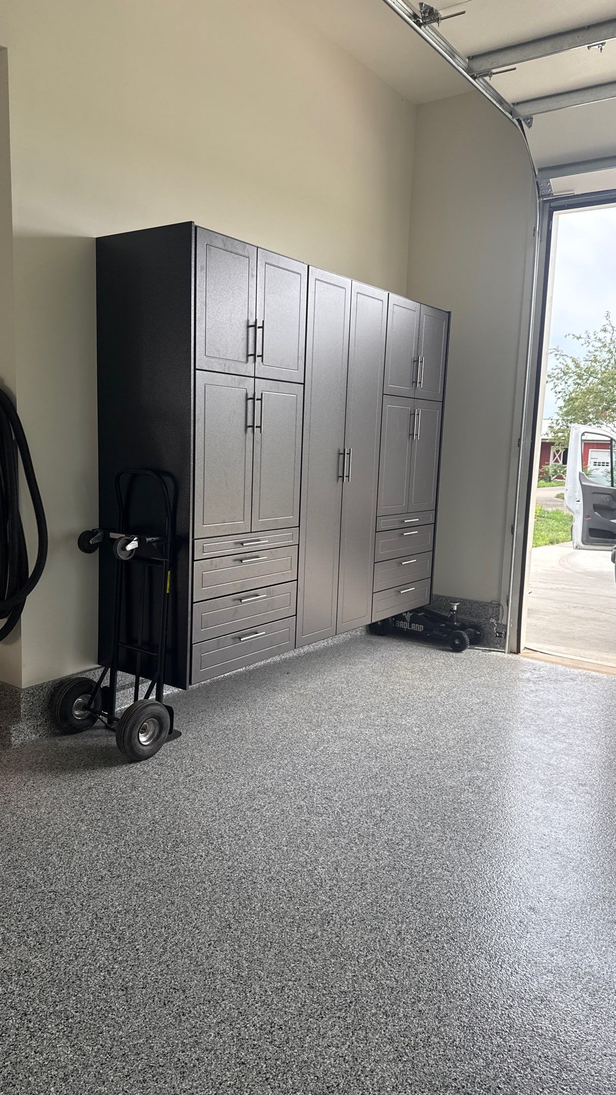 MKE SW: "Textured White", MKE Slatwall, RLGG Cabinets: "Pewter" Powder Coated, RLGG Door/Drawer Style: Reverse Bead (Shaker), Redline GarageGear Cabinets, Motorized Rack, Garage Remodel, Garage Renovation, Garage Upgrade, Garage Wall Storage