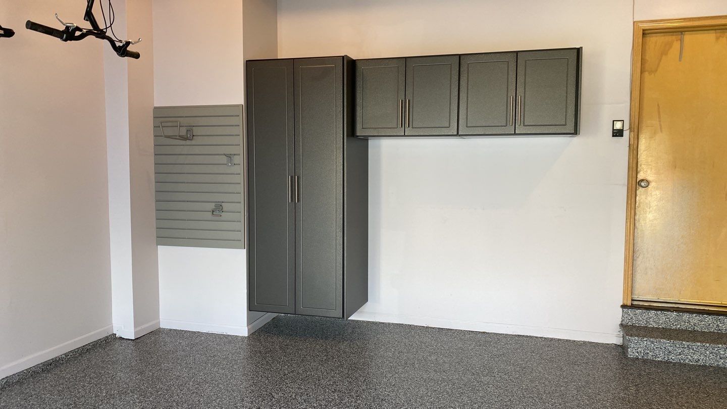 Redline GarageGear Cabinets, RLGG Cabinets: "Pewter" Powder Coated, Heavy Duty Slotwall, SW HD Slatwall: "Weathered Grey", Cabinet Installation, Garage Wall Storage, Garage Addition, Garage Upgrade