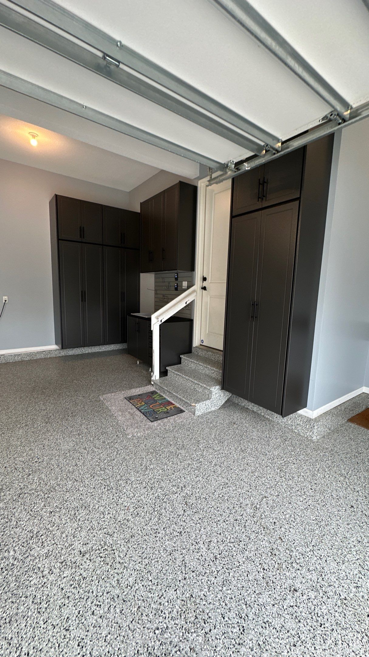 Redline GarageGear Cabinets, Heavy Duty Slotwall, SW HD Slatwall: "Weathered Grey", RLGG Cabinets: "Pewter" Powder Coated, Specialty "Black" HD Workbench/Countertop, Racks: 4'x8' White Ceiling Rack, Specialty Cabinet: Sink, RLGG Door/Drawer Style: Reverse Bead (Shaker), Garage Remodel, Garage Upgrade