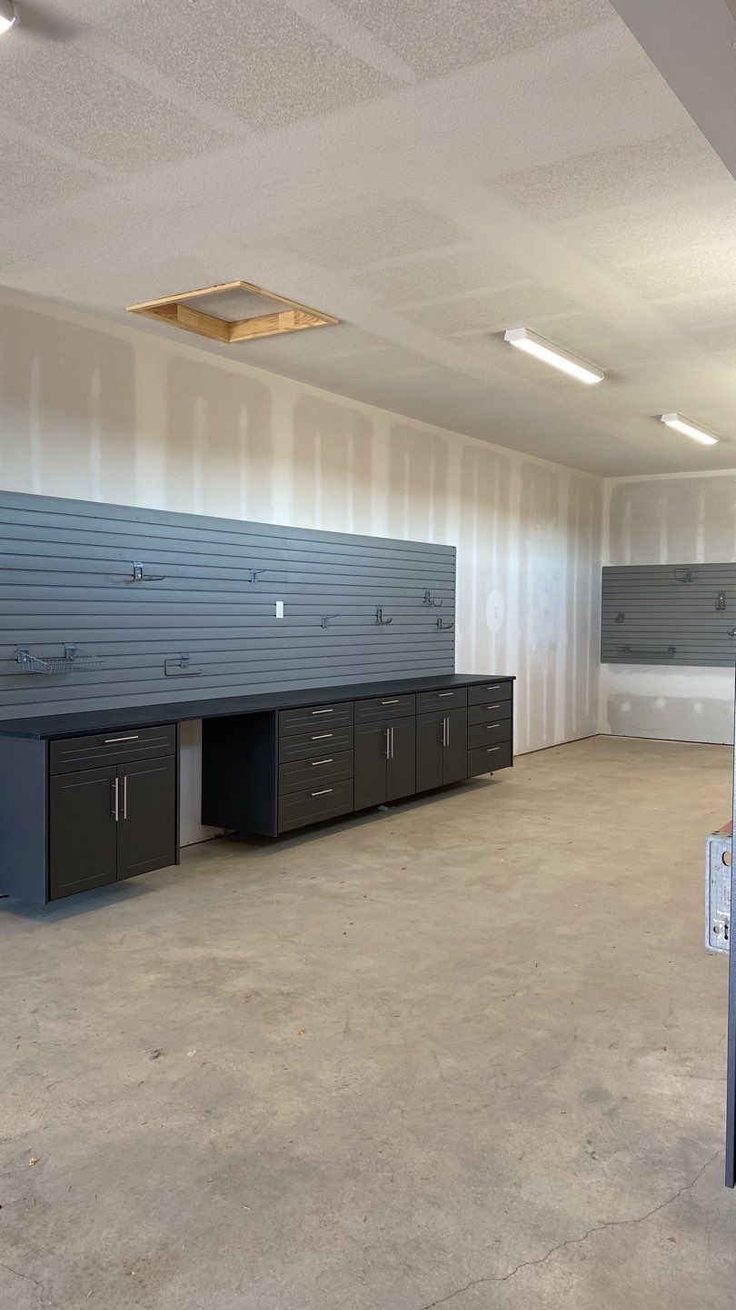 Melissa contacted us well before the 2021 Holiday season and wanted to gift her husband and upgraded garage for Christmas - what an awesome gift! This maybe one of the longest workbenches we have ever installed in the garage - over 16' long! Redline GarageGear: "Pewter" powder-coated wood cabinets, mounted on the wall, up off the floor, brushed nickel 8" pull handles; and heavy duty urethane black workbench countertop. All cabinets are 24" deep to maximize storage in this garage. Slotwall - We only use top-of-the-line Heavy Duty Slotwall. We have tried many different brands of slotwall, and have learned this is the best slotwall money can buy. All the accessories have 1/4" turn cam lock holding the accessory in place. This project includes "Weathered Grey" color slotwall and was added in 15" tall increment strips.