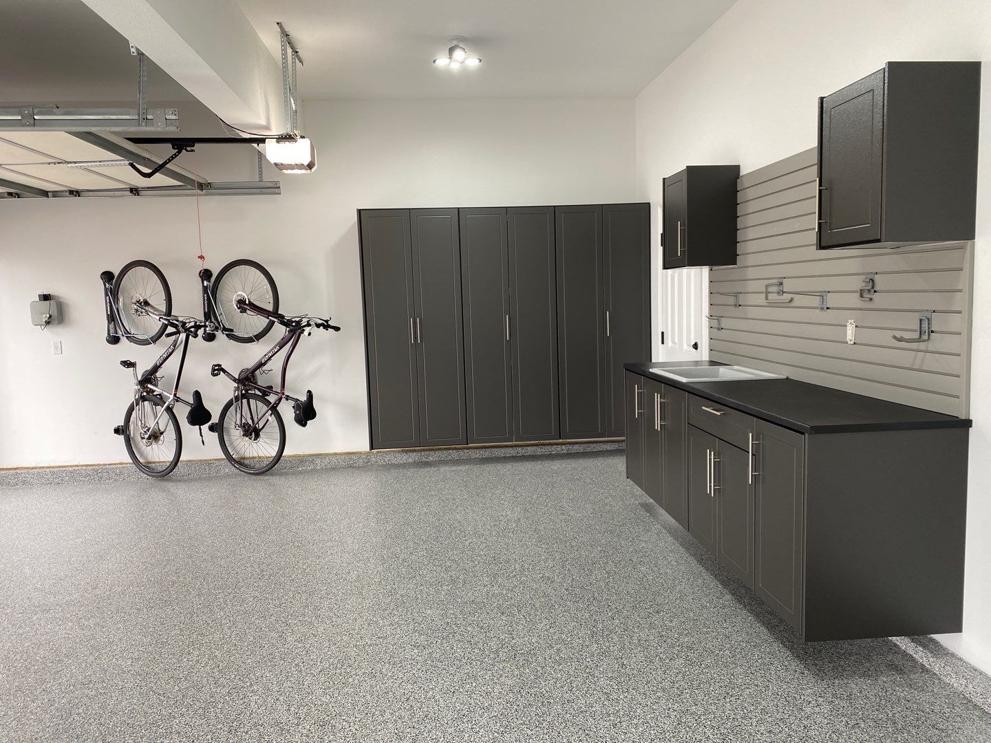 Redline GarageGear Cabinets, RLGG Cabinets: "Pewter" Powder Coated, Heavy Duty Slotwall, SW HD Slatwall: "Weathered Grey", Bike Storage: SteadyRacks, Cabinet Installation, Garage Wall Storage, Garage Addition, Garage Upgrade