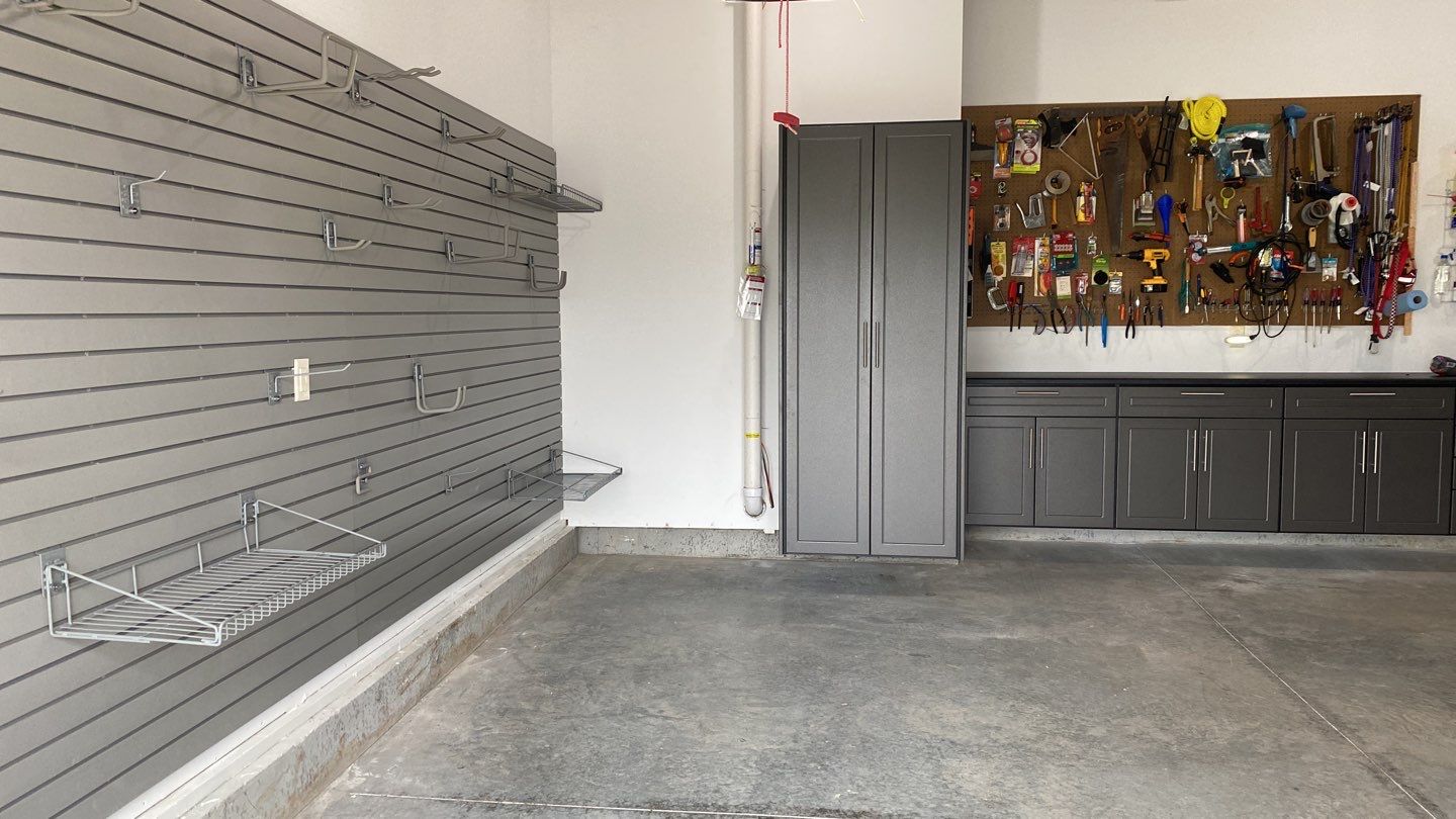 Heavy Duty Slotwall, SW HD Slatwall: "Weathered Grey", Redline GarageGear Cabinets, RLGG Cabinets: "Pewter" Powder Coated, Racks: 4'x8' White Ceiling Rack, Cabinet Installation, Garage Wall Storage, Garage Addition, Garage Upgrade