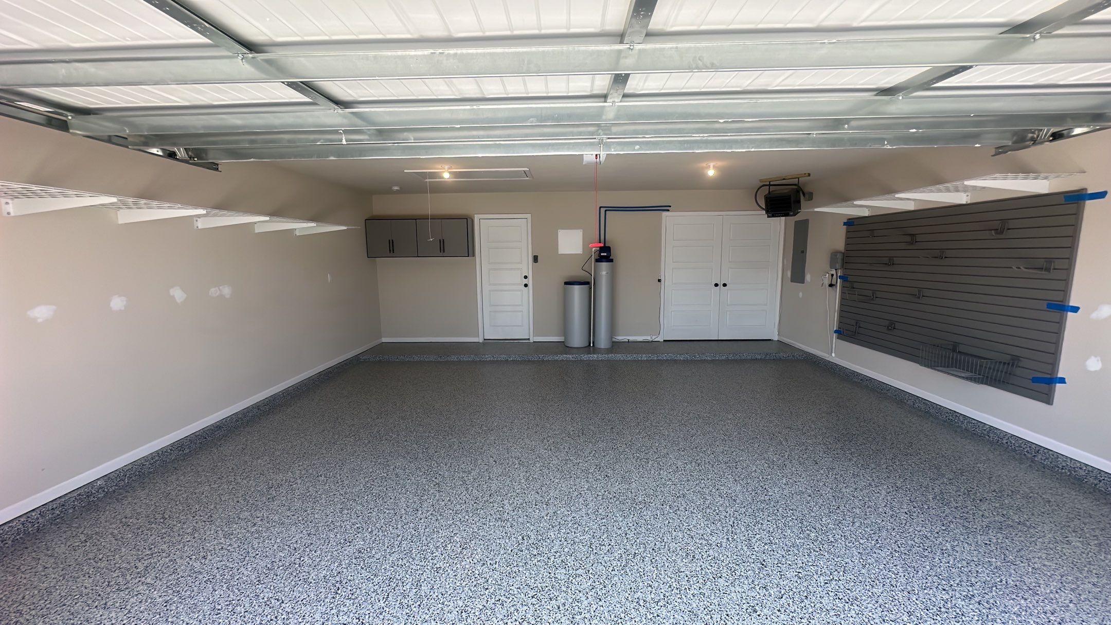 Banner Garage Floor, Redline GarageGear Cabinets, Heavy Duty Slotwall, SW HD Slatwall: "Weathered Grey", BG Floor: "Houndstooth", RLGG Cabinets: "Dove Grey" Powder Coated, RLGG Door/Drawer Style: Reverse Bead (Shaker), Garage Remodel, Garage Upgrade