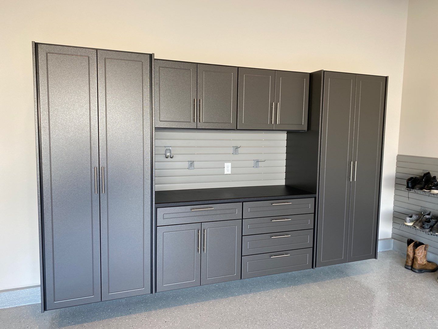 Redline GarageGear Cabinets, RLGG Cabinets: "Pewter" Powder Coated, Heavy Duty Slotwall, SW HD Slatwall: "Weathered Grey", Specialty "Black" HD Workbench/Countertop, Cabinet Installation, Garage Wall Storage, Garage Addition, Garage Upgrade