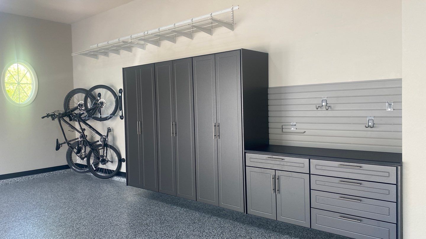 Bike Storage: SteadyRacks, Redline GarageGear Cabinets, RLGG Cabinets: "Pewter" Powder Coated, Heavy Duty Slotwall, SW HD Slatwall: "Weathered Grey", Cabinet Installation, Garage Upgrade, Specialty "Black" HD Workbench/Countertop, Garage Renovation, Garage Wall Storage