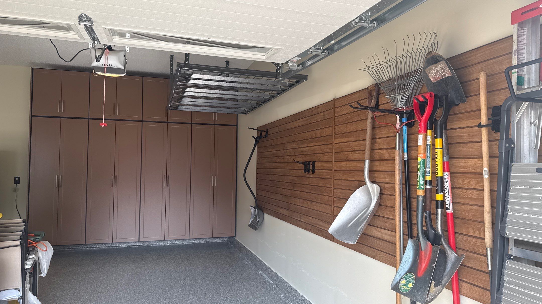 Double Stack, RLGG Cabinets: "Earthstone" Powder Coated, RLGG Door/Drawer Style: Reverse Bead (Shaker), Redline GarageGear Cabinets, Racks: 4'x8' Hammertone Ceiling Rack, MKE SW: "Western Cedar", Garage Remodel, Garage Renovation, Garage Upgrade, Garage Wall Storage