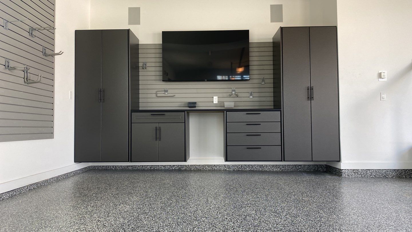 RLGG Cabinets: "Pewter" Powder Coated, Cabinet Installation, Garage Wall Storage, Garage Upgrade, Heavy Duty Slotwall, SW HD Slatwall: "Weathered Grey", Redline GarageGear Cabinets, BG Floor: "Banner", Banner Garage Floor