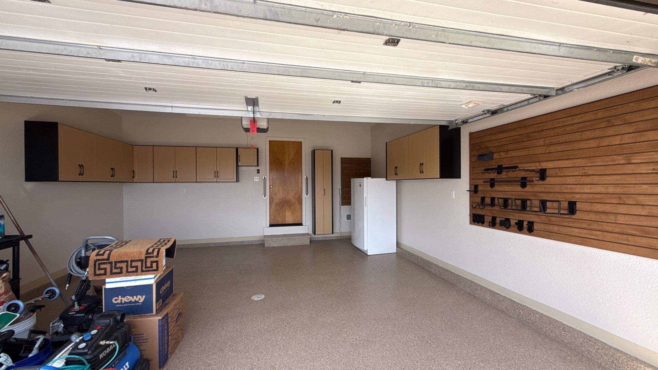 MKE SW: "Western Cedar", MKE Slatwall, RLGG Cabinets: "Black" Powder Coated, RLGG Cabinets: "Sandstone" Powder Coated, RLGG Cabinets: "Two-Tone", RLGG Door/Drawer Style: Reverse Bead (Shaker), Redline GarageGear Cabinets, Garage Remodel, Garage Renovation, Garage Upgrade, Garage Wall Storage