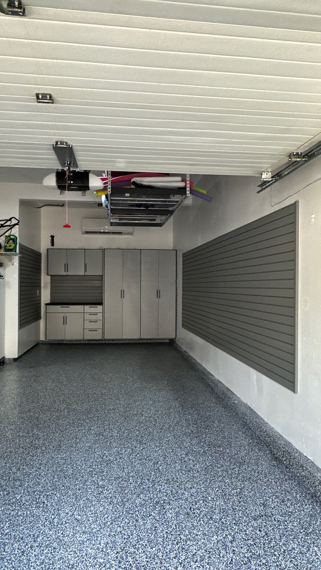BG Floor: "Banner Blue", Banner Garage Floor, RLGG Cabinets: "Dove Grey" Melamine, SW HD Slatwall: "Weathered Grey", Racks: 4'x8' Hammertone Ceiling Rack, Garage Renovation, Garage Upgrade, Garage Wall Storage