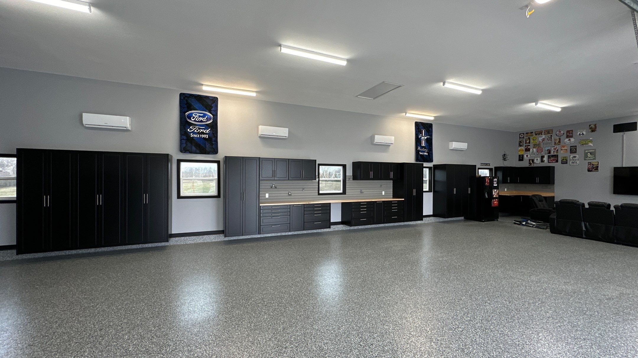 Heavy Duty Slotwall, RLGG Cabinets: "Black" Powder Coated, RLGG Door/Drawer Style: Reverse Bead (Shaker), Specialty "Black" HD Workbench/Countertop, SW HD Slatwall: "Weathered Grey", Garage Remodel, Garage Renovation, Garage Upgrade, Garage Wall Storage