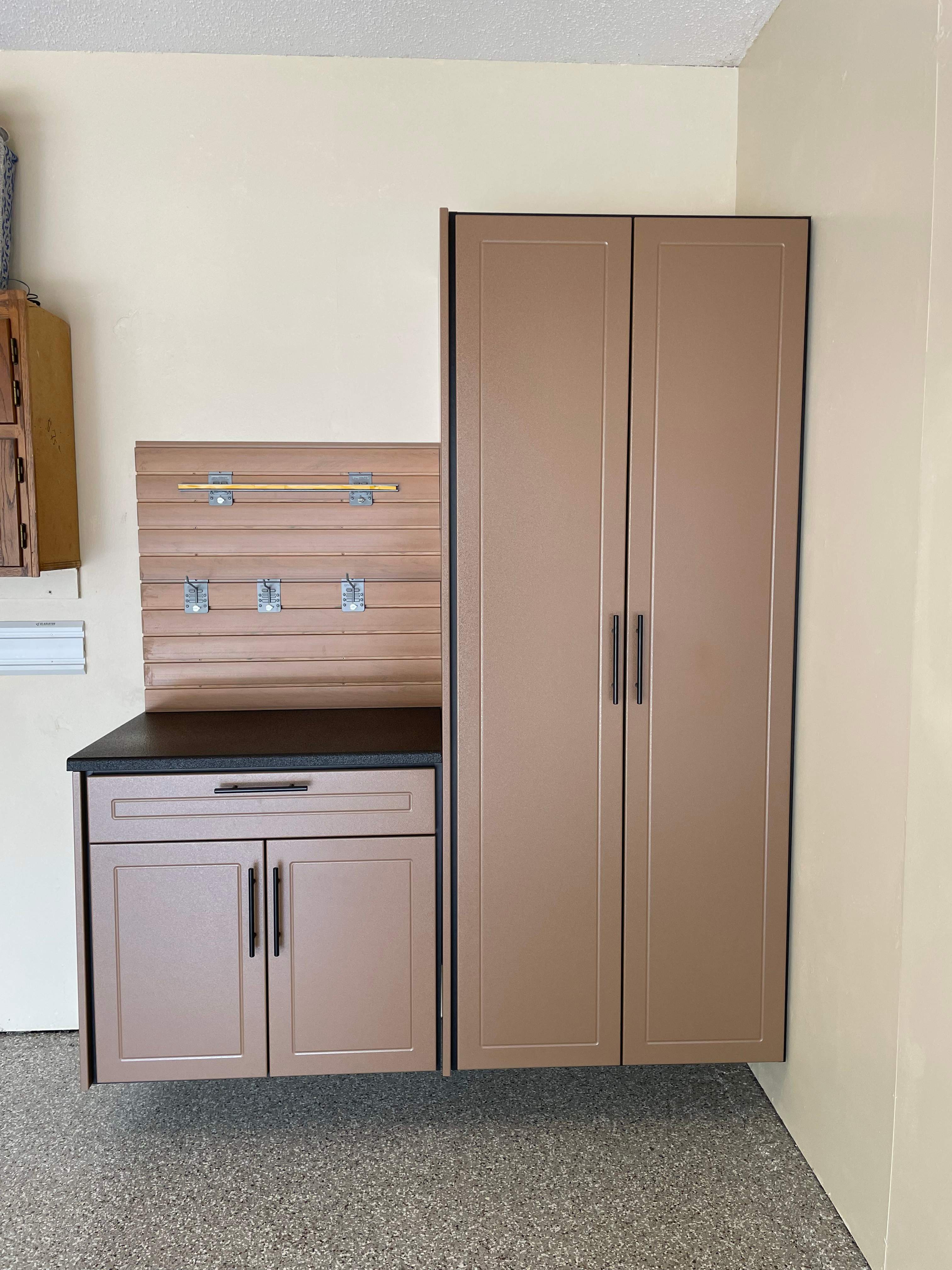 Banner Garage Floor, BG Floor: "Creekbed", Heavy Duty Slotwall, SW HD Slatwall: "Rustic Cedar", Redline GarageGear Cabinets, RLGG Cabinets: "Earthstone" Powder Coated, Cabinet Installation, Flooring Installation, Garage Addition, Garage Upgrade, Garage Wall Storage