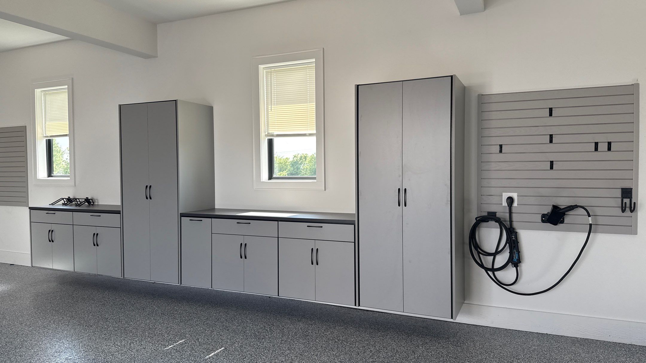 MKE SW: "Textured Grey", MKE Slatwall, RLGG Cabinets: "Dove Grey" Melamine, Redline GarageGear Cabinets, Windswept Pewter Countertop, Garage Remodel, Garage Renovation, Garage Upgrade, Garage Wall Storage