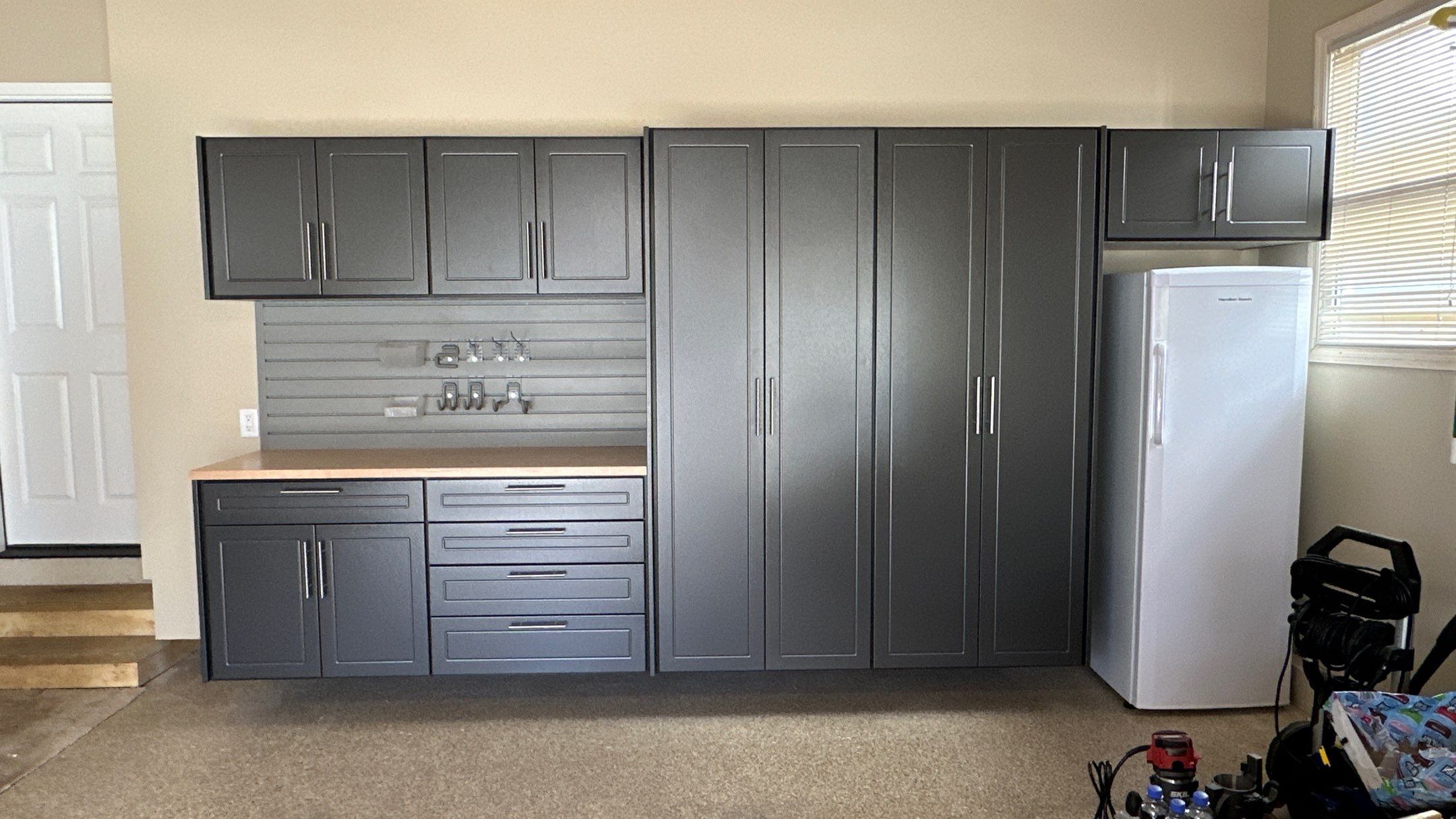 Heavy Duty Slotwall, RLGG Cabinets: "Pewter" Powder Coated, RLGG Door/Drawer Style: Reverse Bead (Shaker), Redline GarageGear Cabinets, SW HD Slatwall: "Weathered Grey", Garage Remodel, Garage Renovation, Garage Upgrade, Garage Wall Storage