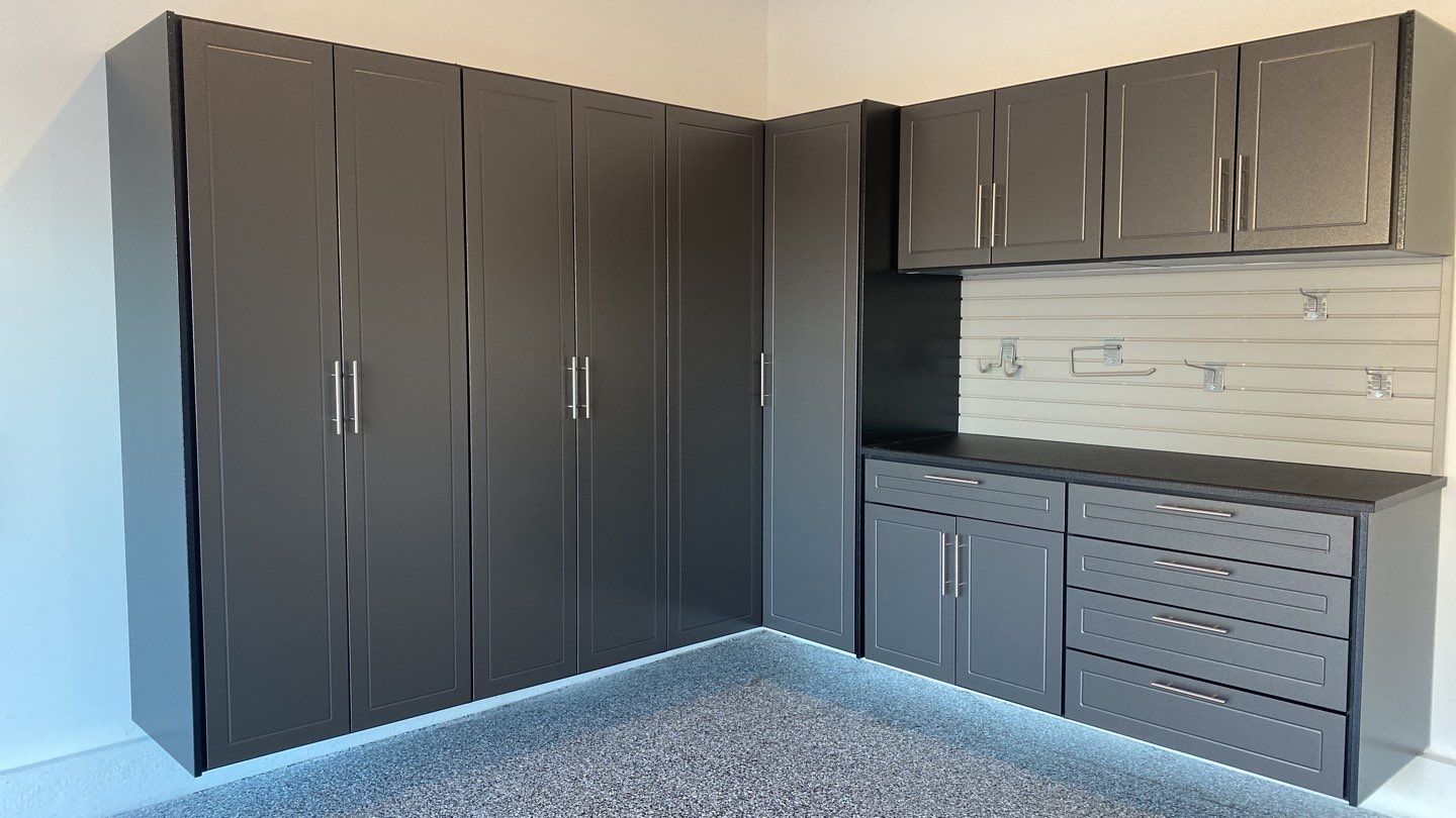 Troy is getting the most out of his "extra" garage in Parkville Missouri! We love it when homeowners get creative and decide to use two different colors of our powder coated cabinets. You have to look closely, but the end panels of the cabinets are "Black" and the front of the cabinets are "Pewter". Match that along with the Black workbench top and "Weathered Grey" Slotwall and you get one sharp garage. Also note one of our best selling ways to store bikes in the garage are with using our "SteadyRack" bike storage. Easy to get up off the floor and folds away for storage or easy access.