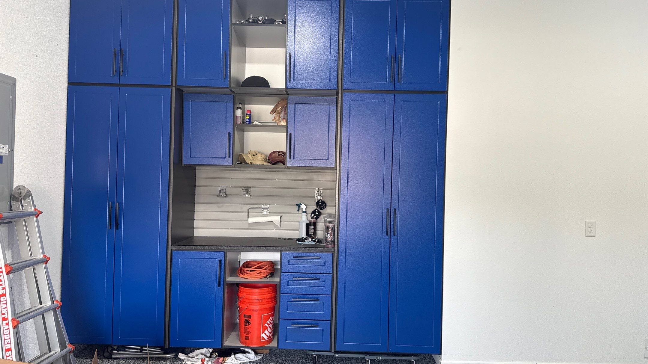 RLGG Cabinets: "Royal Blue" Powder Coated, RLGG Cabinets: "Pewter" Powder Coated, RLGG Cabinets: "Two-Tone", RLGG Door/Drawer Style: Reverse Bead (Shaker), Specialty "Black" HD Workbench/Countertop, Garage Remodel, Garage Renovation, Garage Upgrade