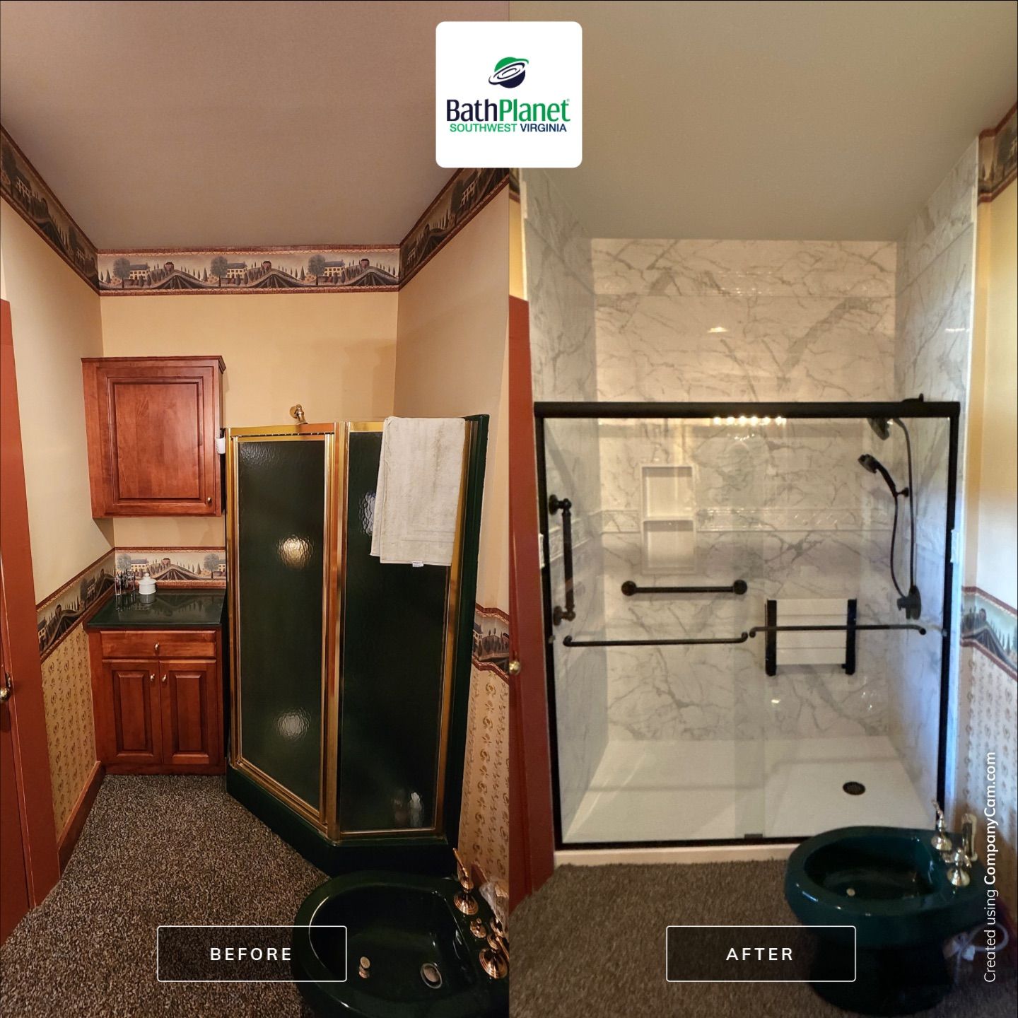 This shower doubled in space, allowing for plenty of room and even a "dry area" to get in and out. This unique setup ensures comfort but also allows for assistance down the road if needed.