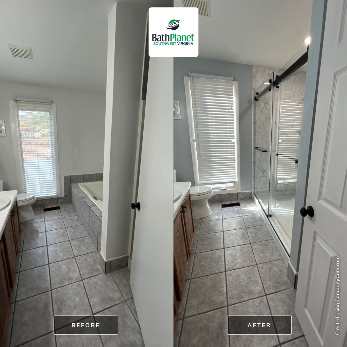 White, Calcutta Marble, Hexagon Pattern, Grayline, Bench Seat, Matte Black, Double Slider Barn Door, Tub to Shower
