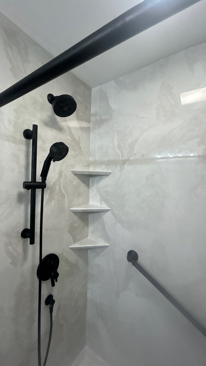 Silver White Marble, Matte Black, Bathroom Remodel, Flooring Installation, Vanity Install, Wainscoting Install