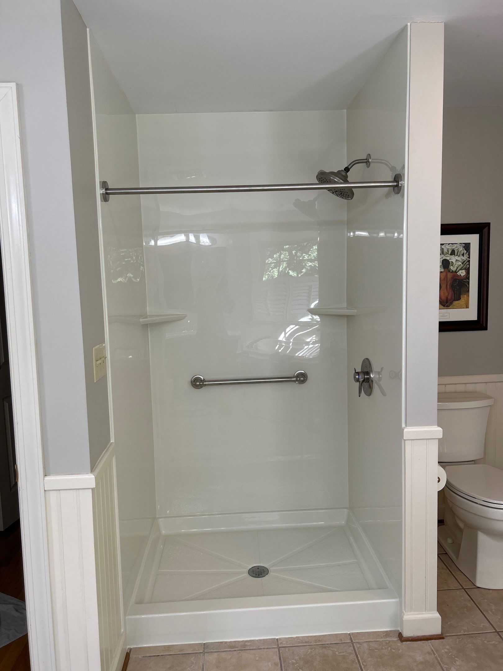 This is why we install materials custom fit to your space. Look at how much more room is in this shower because our system actually goes flush to the wall on all sides!