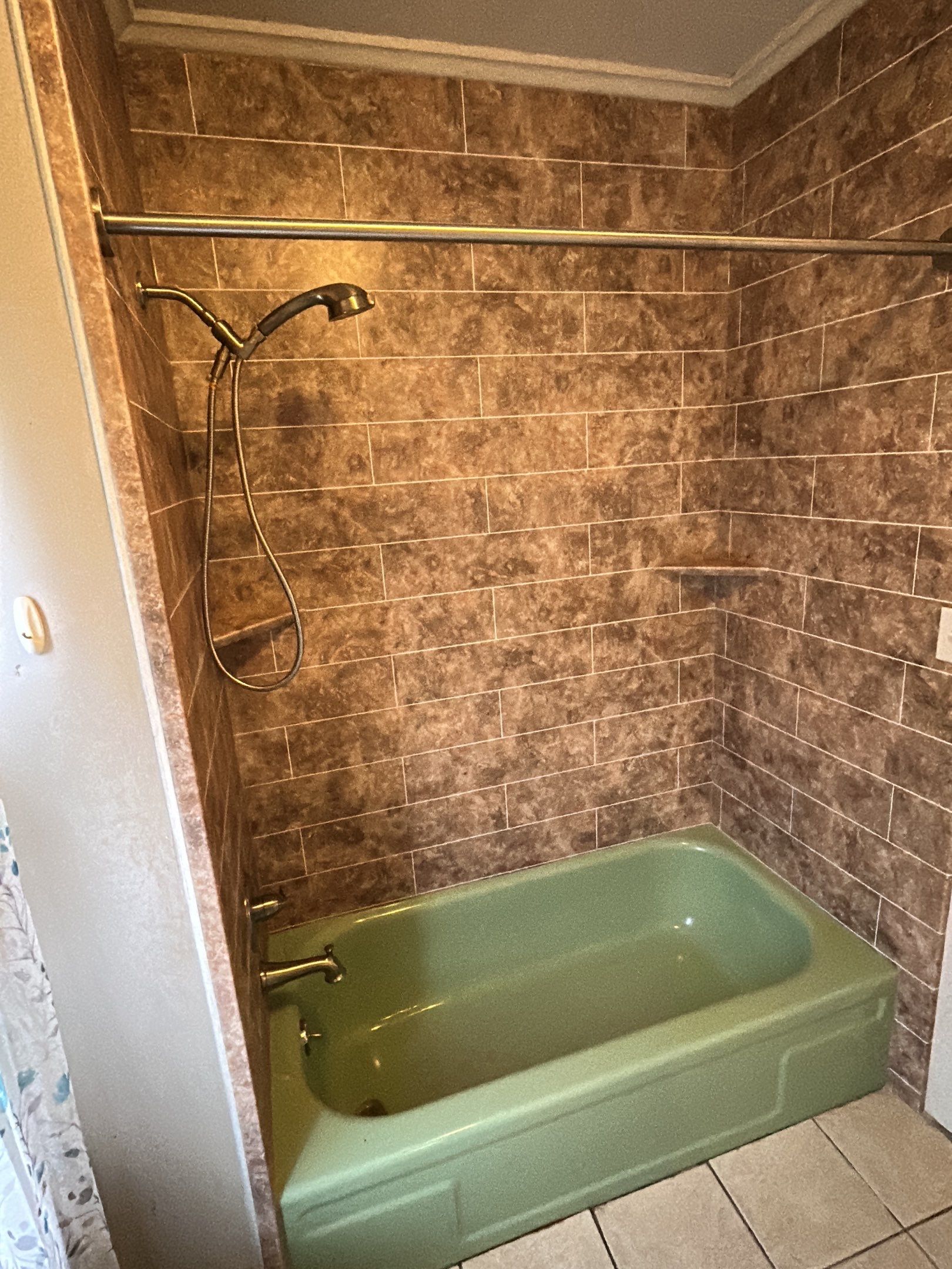 When you love your old-school tub but just want a facelift with updated plumbing. That River Rock wall looks great with that green!