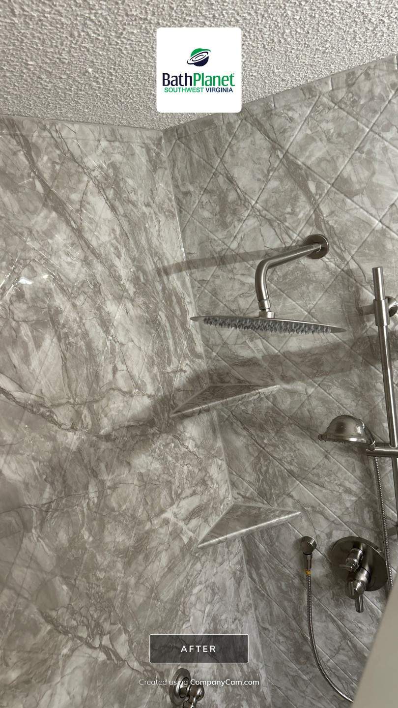 Pompeii Marble, Pressed Tile, Diamond Pattern, Brushed Nickel, Tub to Shower