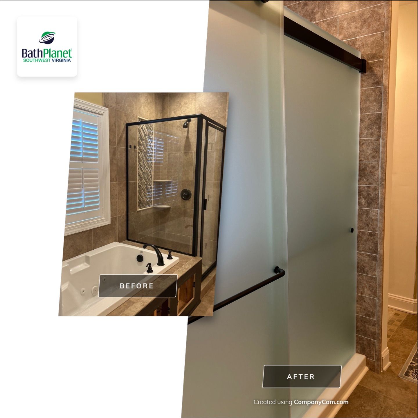 River Rock, White, Oil Rubbed Bronze, Obscured Glass, Barn Door, Flooring, Bathroom Remodel