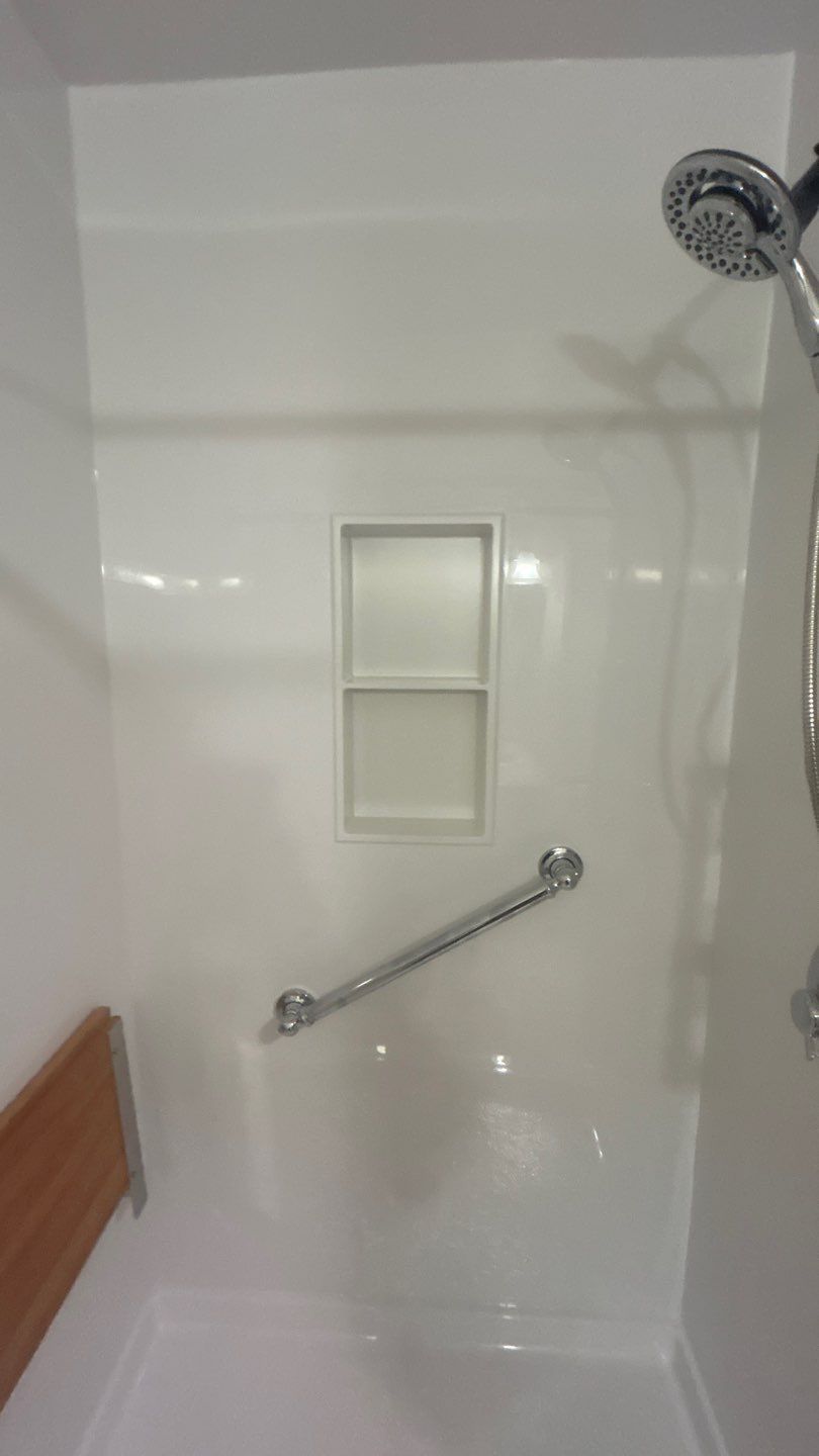White, Chrome, Niche, Teak Seat, Halo Showerhead, Shower Stall, Shower Upgrade
