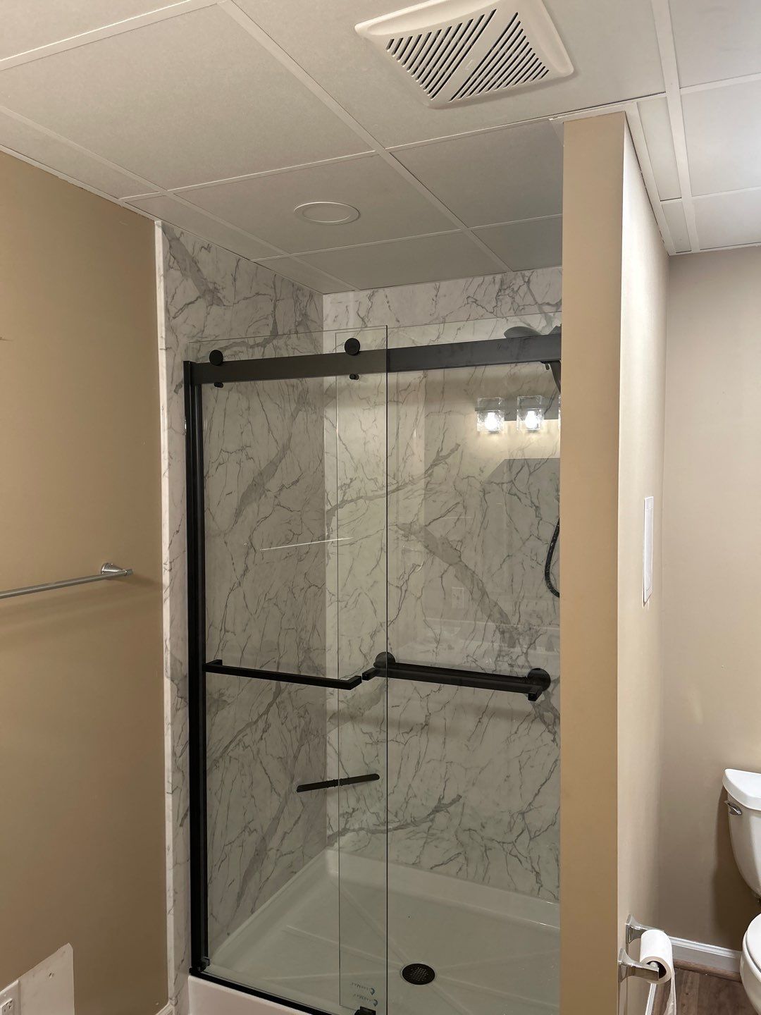 Calcutta Marble, Matte Black, Shower Upgrade, Vanity Install, Lighting Installation