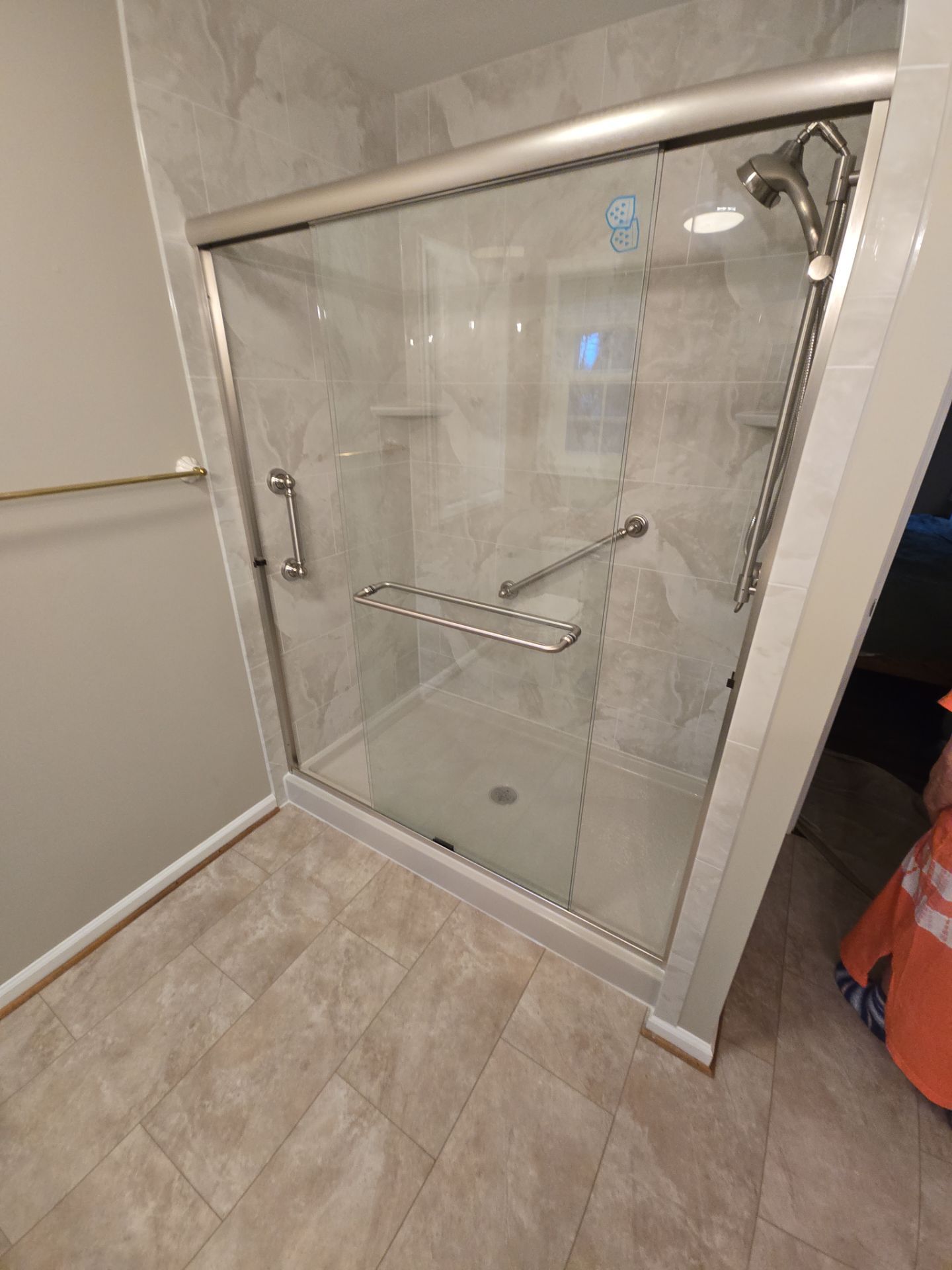 A gray pan adds a unique touch to this standard tub to shower conversion.
