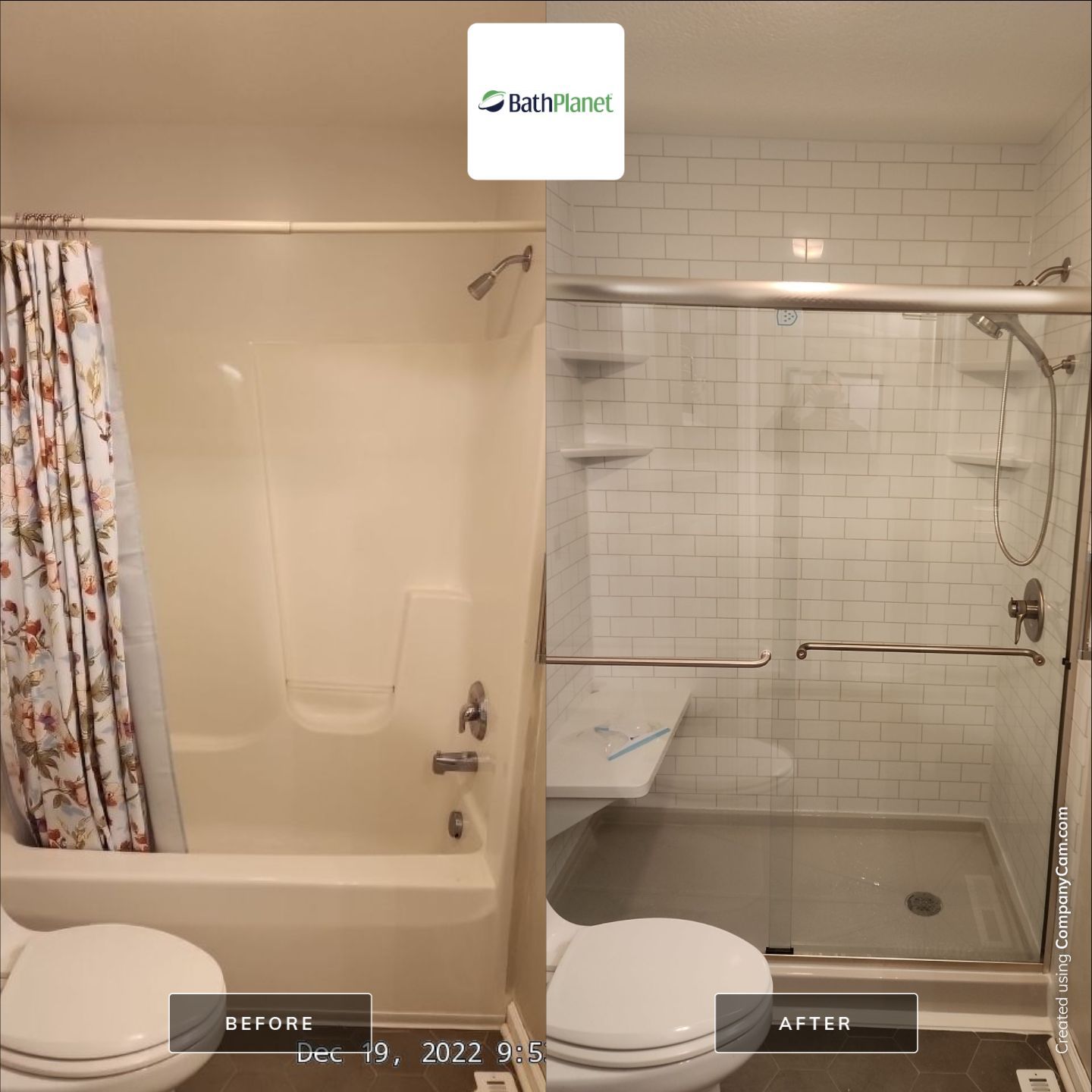 Gray shower pan and white bench seat really make the white subway tile with gray grout stand out. And the brushed nickel features complete this classic look.