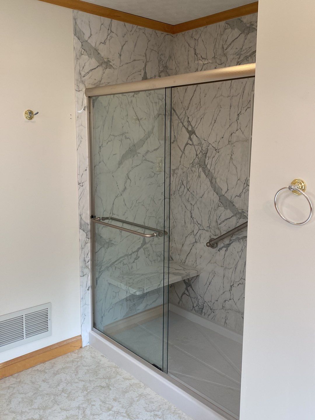 Calcutta Marble, White, Brushed Nickel, Niche, Tub to Shower