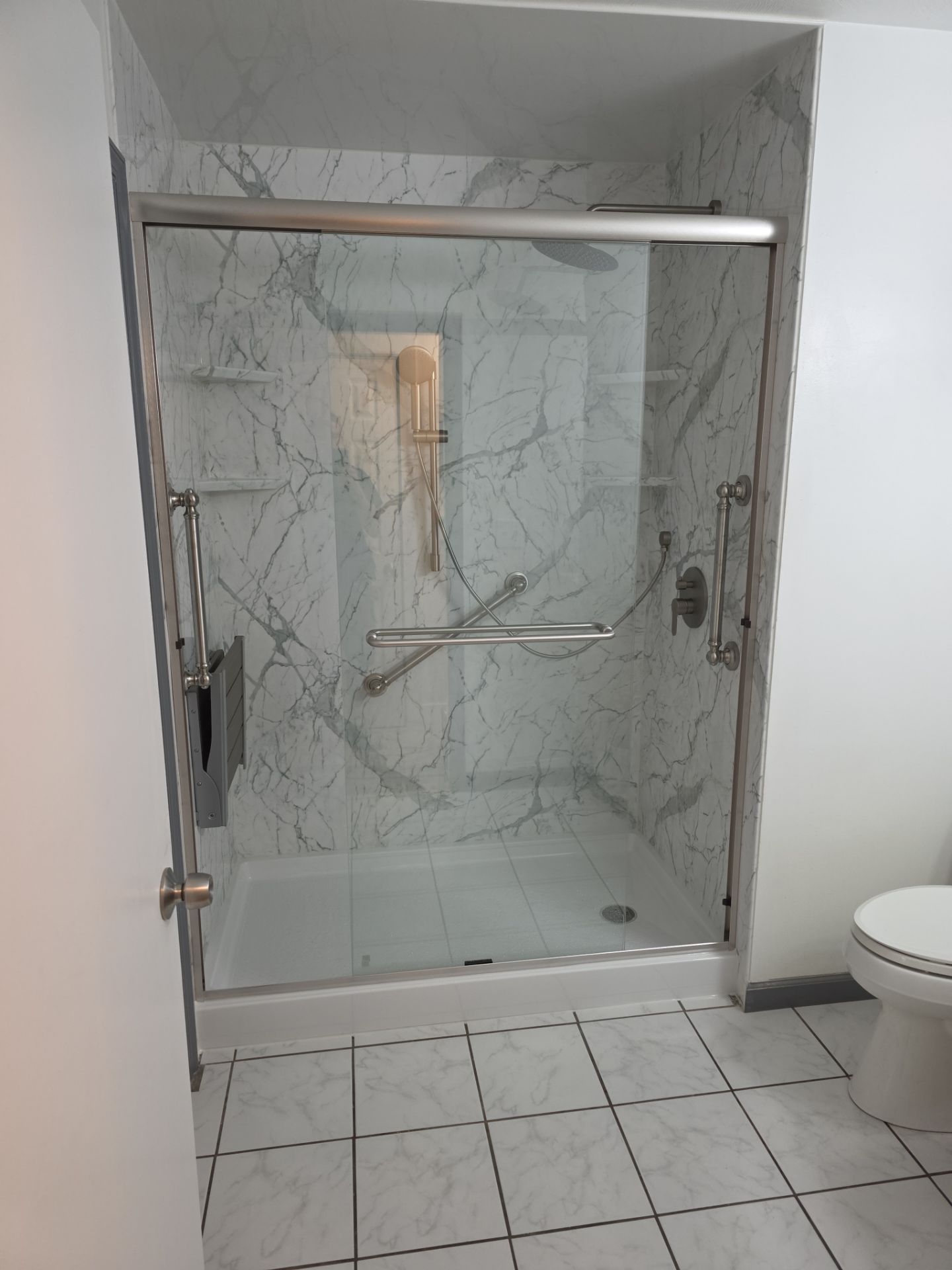 Calcutta Marble, Brushed Nickel, Composite Seat, Tub to Shower