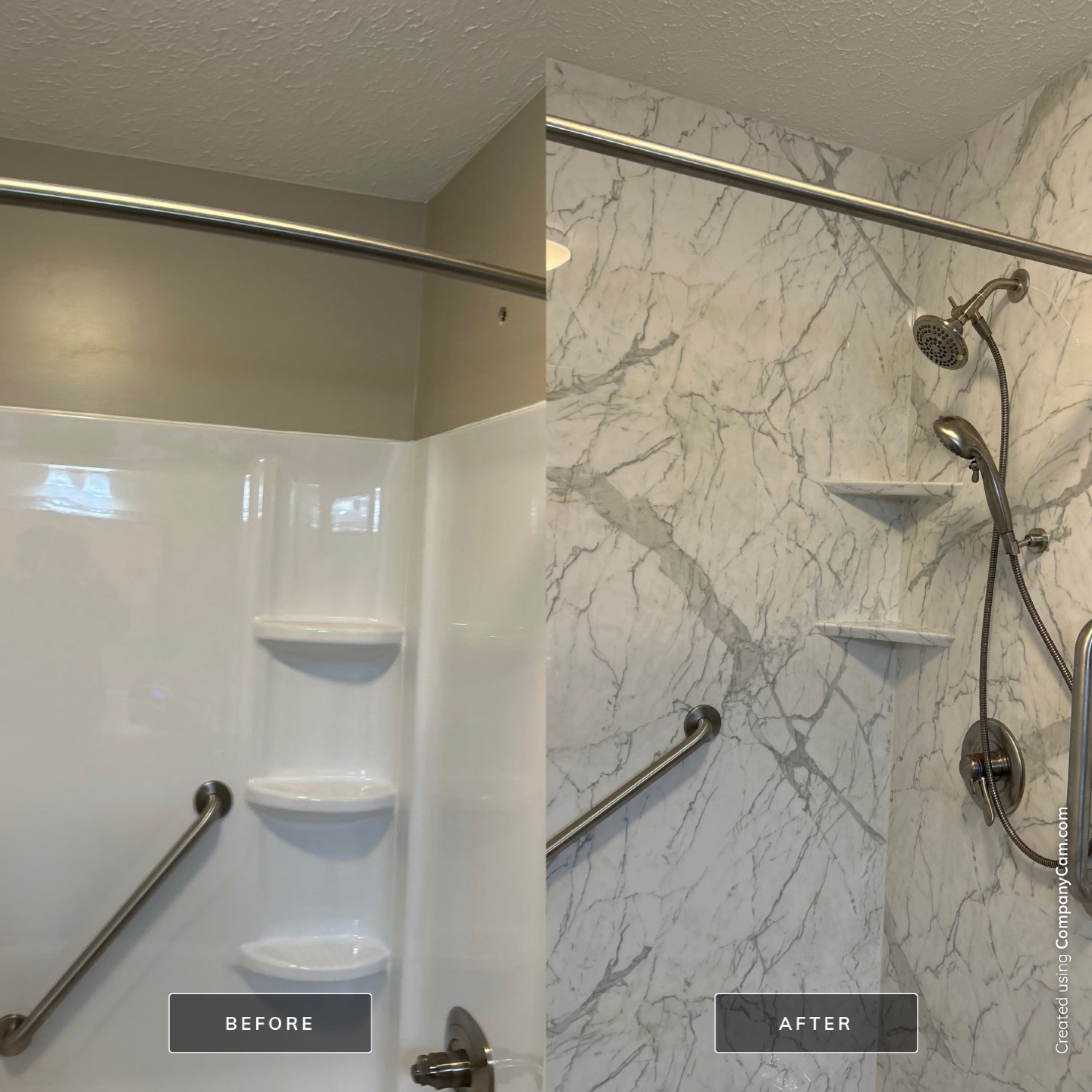 Calcutta Marble, Bench Seat, Brushed Nickel, Tub to Shower