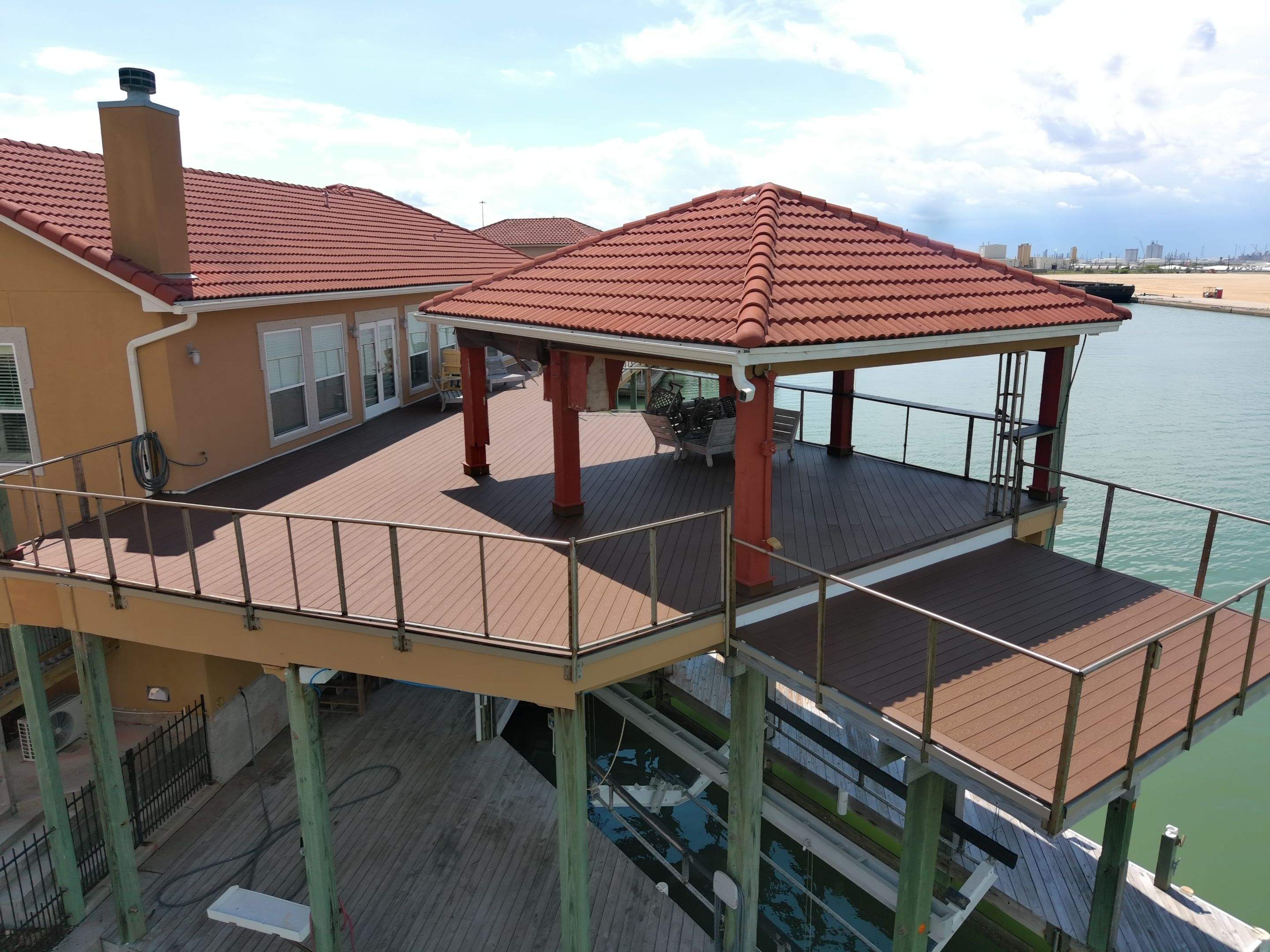 This beautiful home on North Beach Corpus Christi had a large upstairs walkout patio. The underside was stucco for a finished look, however, the previous contractor had not properly water proofed the upper deck and most of the structure had rotted away and was in serious disrepair. Bayfront Crew fixed them Right Up! TPO membrane for full waterproofing protection and down goes Trex composite decking. Beautiful! She Loves It!!