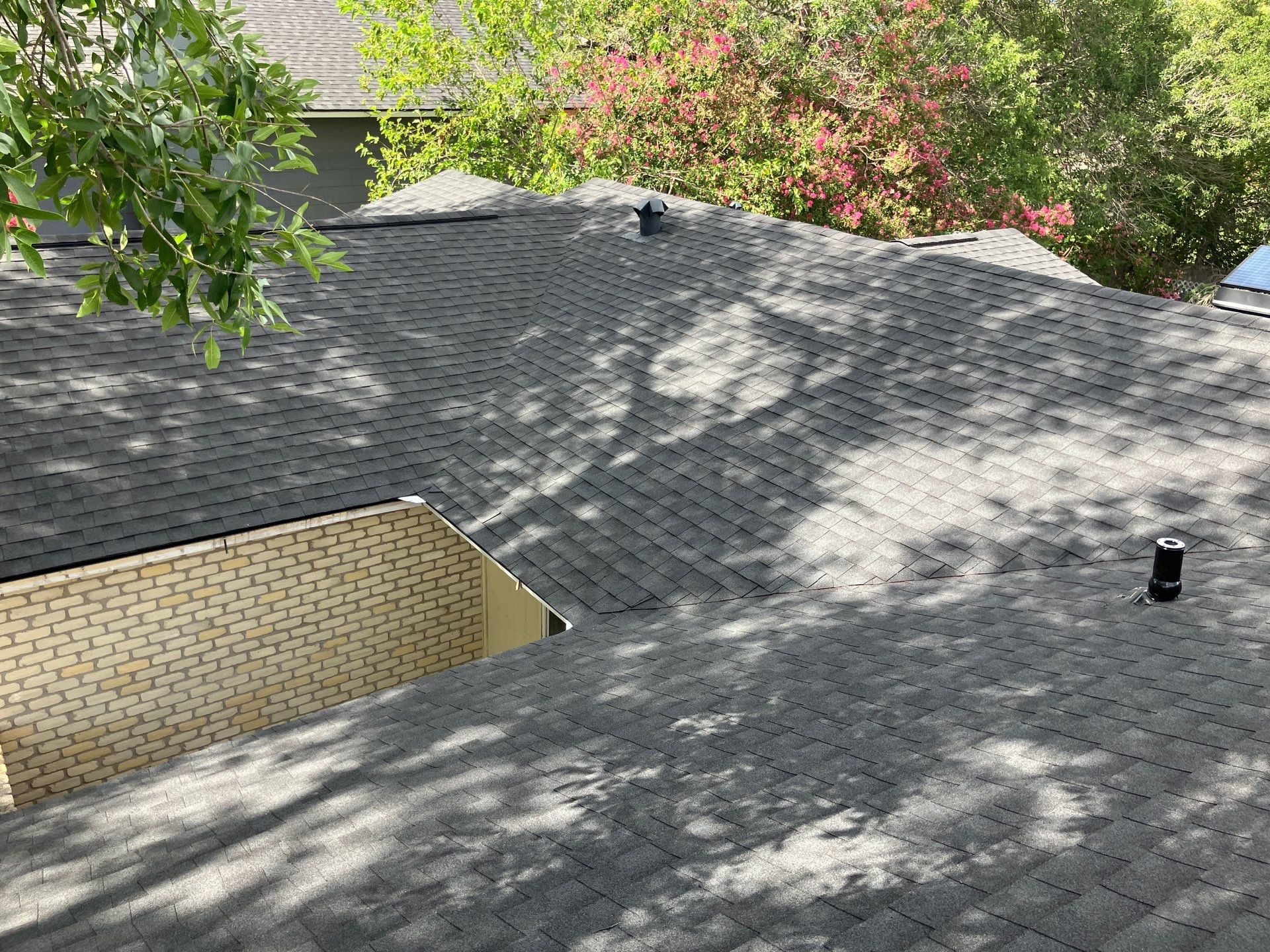 Roof replacement in San Antonio, TX featuring GAF Natural Shadow shingles in Charcoal, delivering durable protection, modern curb appeal, and long-lasting performance.