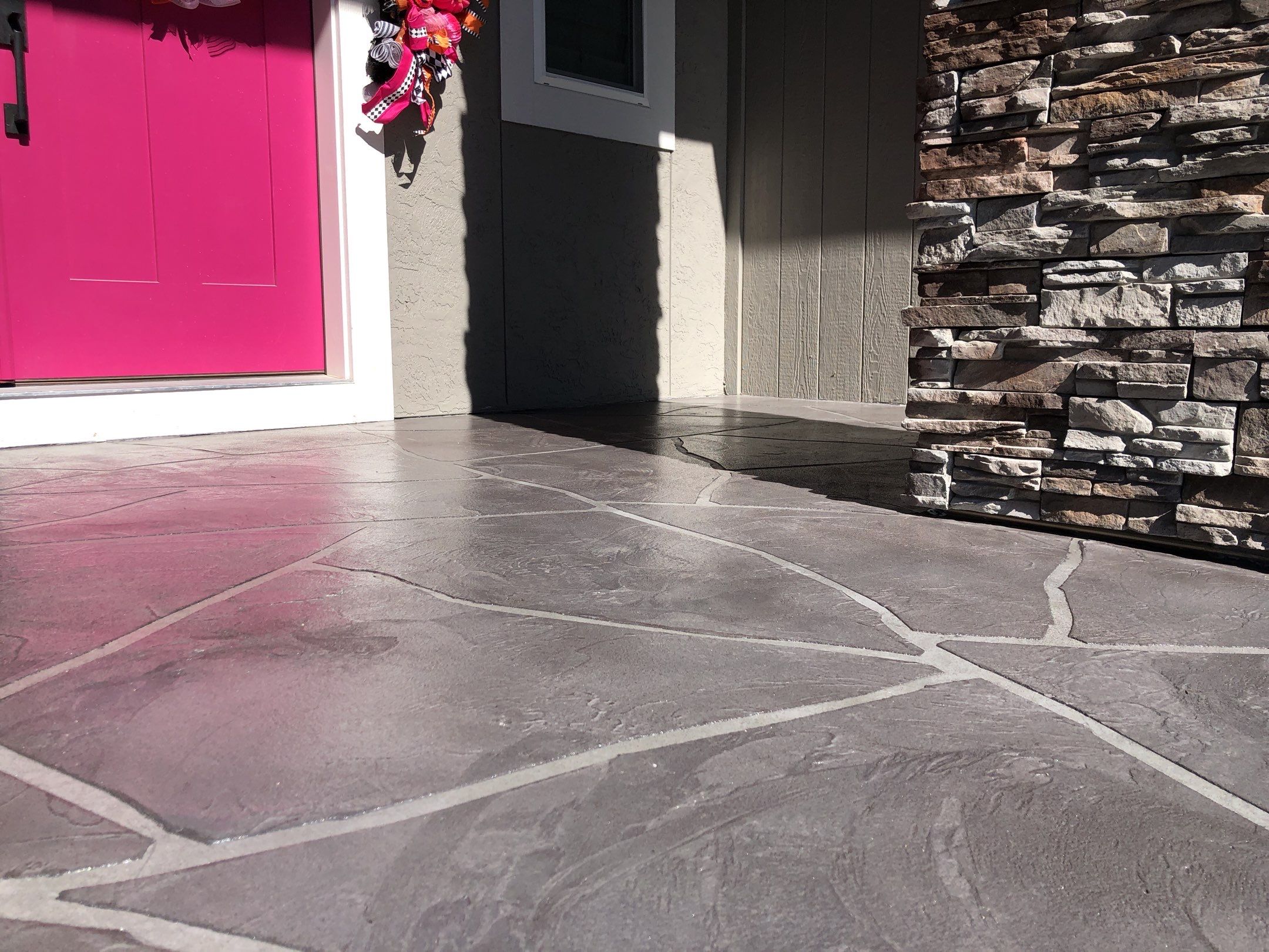 Using a Flagstone patterned overlay will help mask/hide existing cracks in your patio, porch or sidewalk. The random pattern will be stained/dyed to create a realistic stone finish.