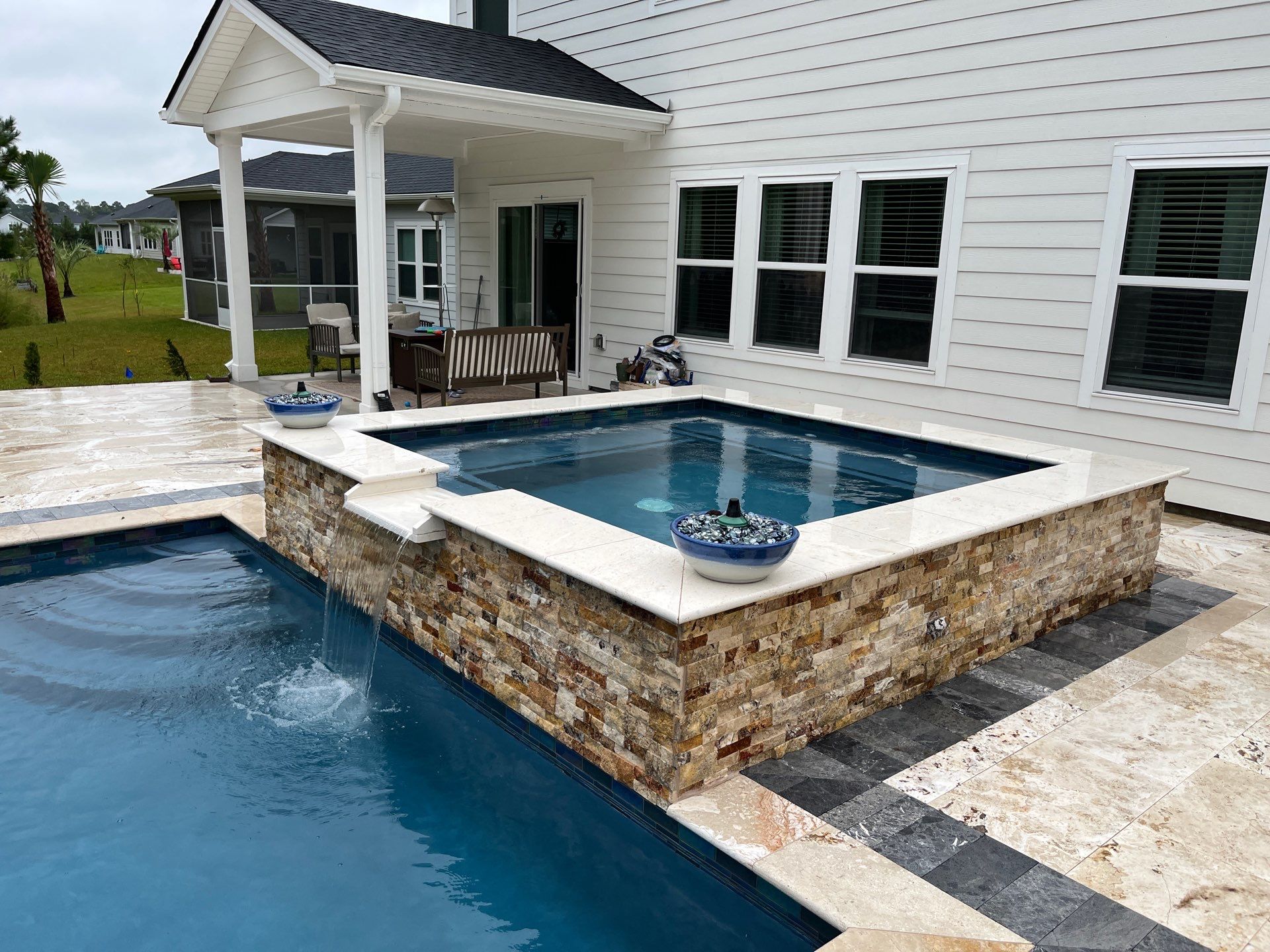 Myra/Shell beige travertine, Scabos Ledger Stone, Pool/Spa