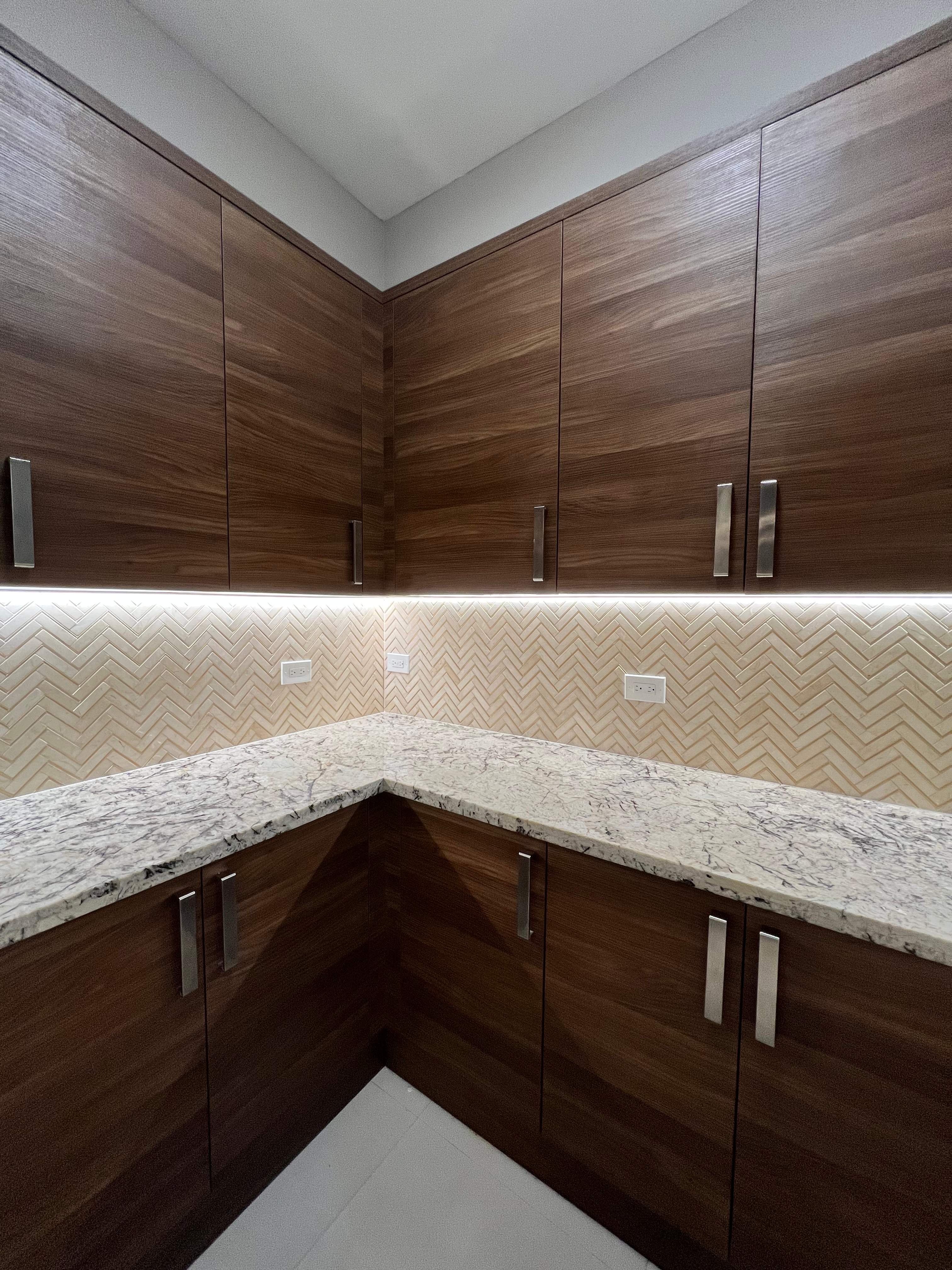 Butler's pantry backsplash with porcelain and metal mosaic tile.