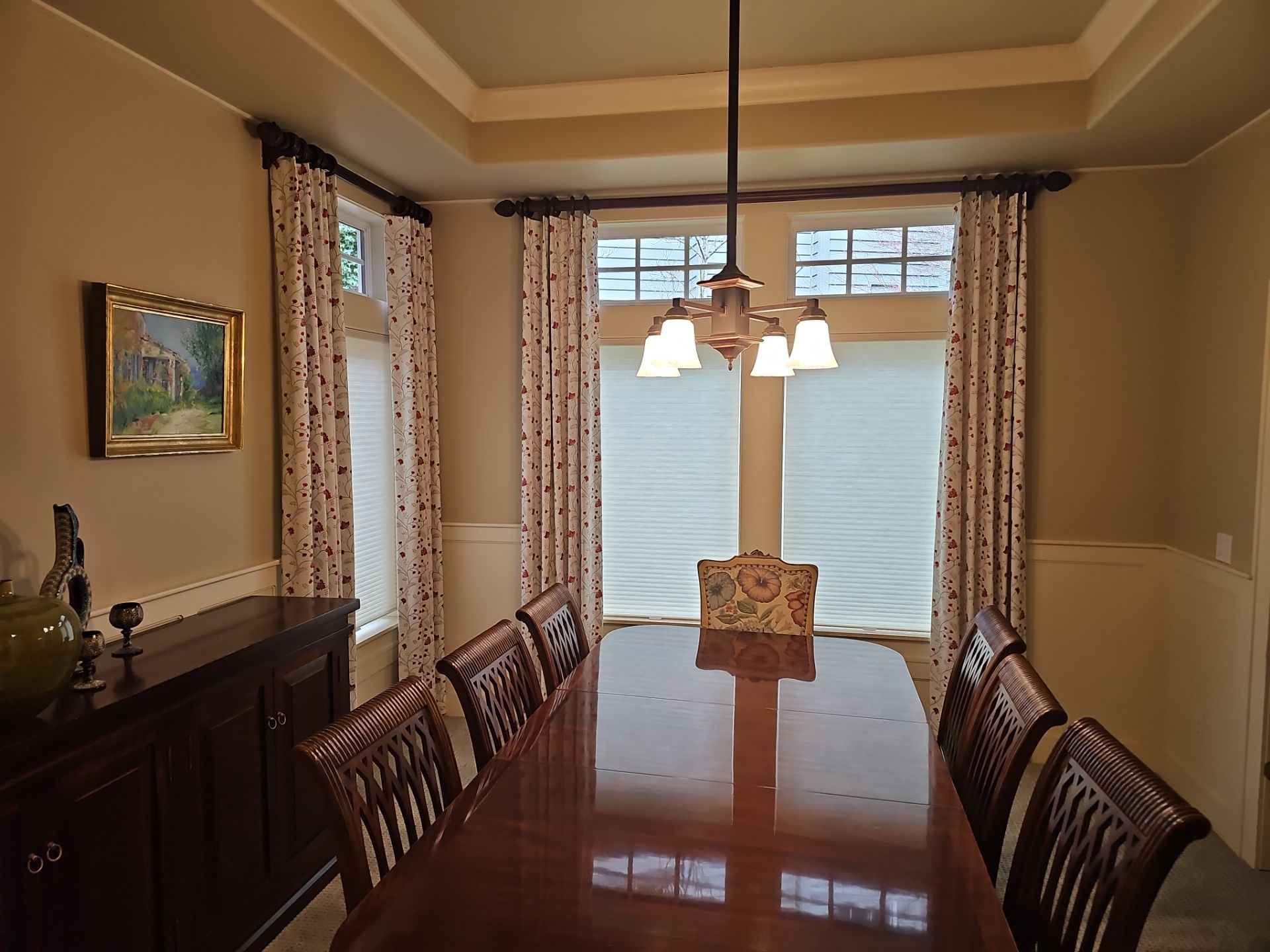This beautiful Northwest Heights home, a simple custom drapery update made a dramatic difference. We replaced heavy, worn, dark curtains with a light and bright embroidered floral drapery, instantly refreshing the space with softness, texture, and natural light. To keep the project budget-conscious, we reused the client’s existing wood hardware—blending sustainability with elevated design. The result is a fresh, airy look that enhances the room while maintaining warmth and character.
