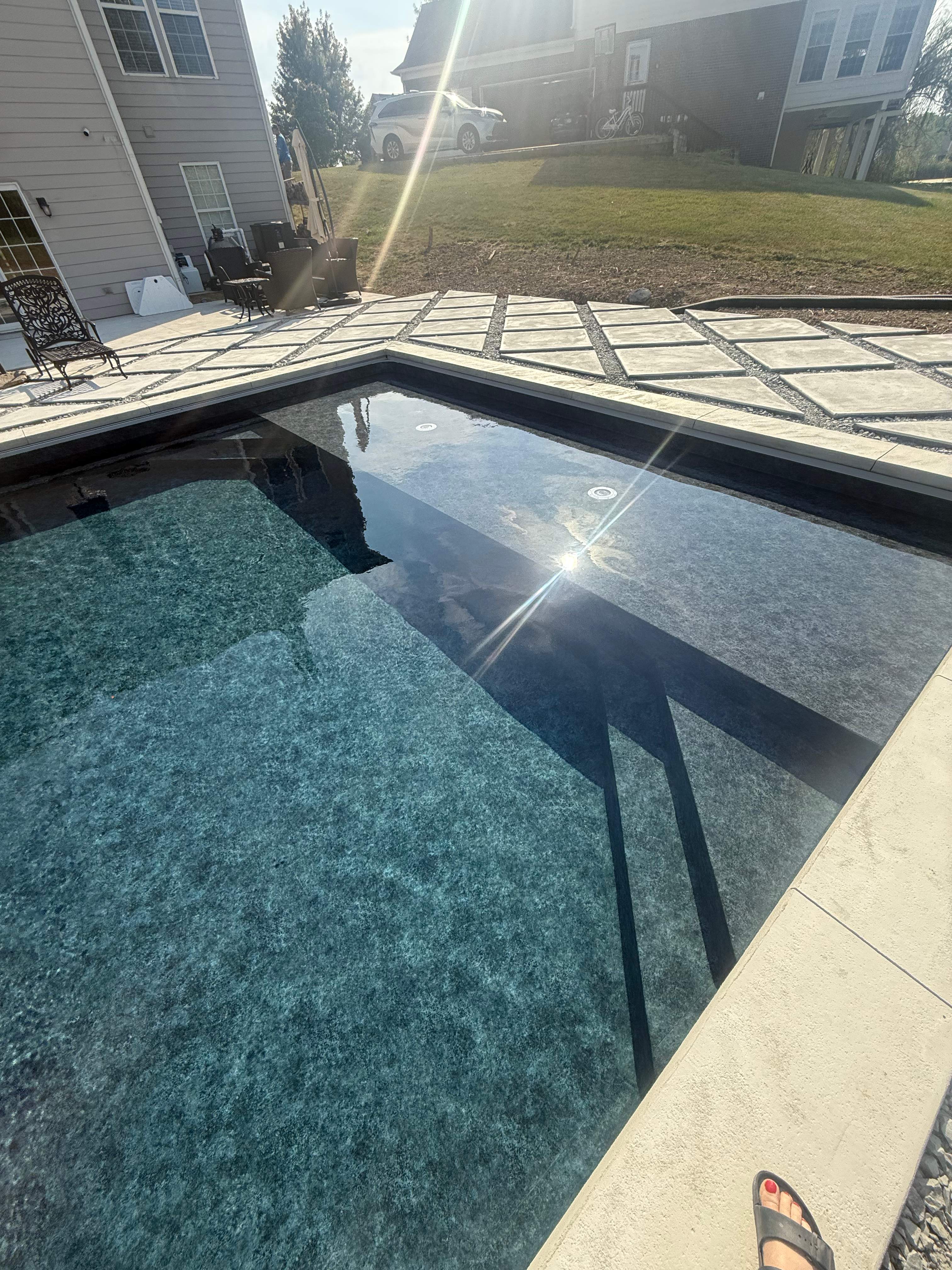 This custom-designed 20'x36' pool blends modern elegance with thoughtful features to create a true backyard retreat. The water showcases a rich, deep blue tone with subtle variations, complemented by the Merlin Island Onyx liner, giving it a clean, luxurious look that shifts beautifully with sunlight. The interior finish adds depth and clarity, enhancing reflections and delivering a calm, resort-inspired feel throughout the pool. A spacious tanning ledge provides the perfect place to relax or lounge in shallow water, finished in a complementary gray tone that transitions seamlessly into the deeper pool interior. Crisp, light-colored Ash White coping frames the pool with sharp definition while staying cool underfoot and providing a refined contrast to the darker waterline. Surrounding the pool is a striking geometric concrete patio design featuring large-format slabs set in decorative stone and gravel joints that will eventually be replaced with artificial turf. This layout adds visual interest while maintaining durability and low maintenance. The neutral concrete tones pair effortlessly with the pool’s water color, creating a cohesive and upscale outdoor space. A raised stone water feature completes the design, featuring three sheer descent waterfalls that add movement, sound, and visual drama. The textured stone facade and smooth capstone bring architectural balance, while the cascading water enhances the tranquil atmosphere. Together, these elements create a sophisticated outdoor living environment—perfect for entertaining, relaxing, and enjoying a timeless pool design built for both beauty and performance.