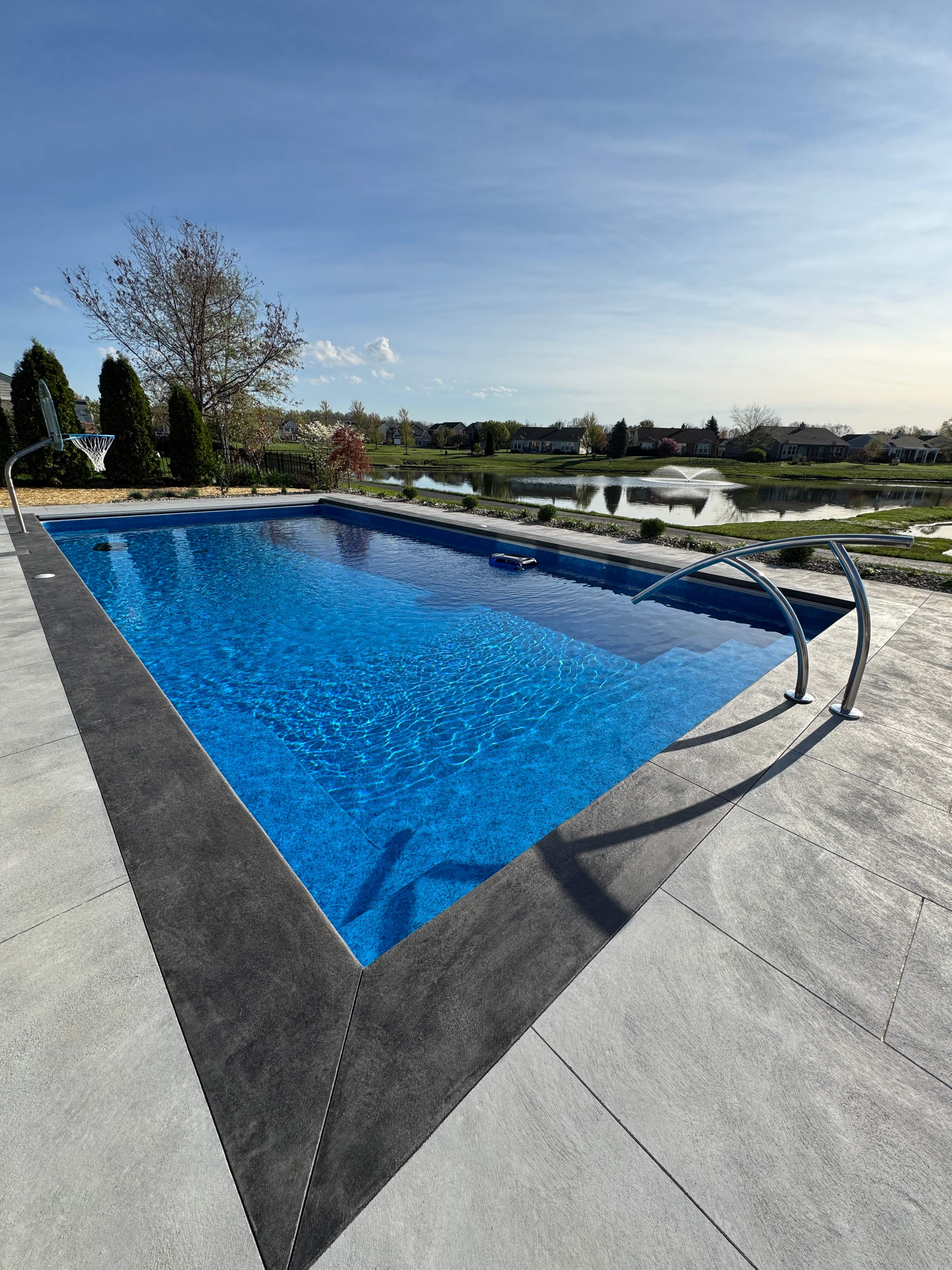 This 16'x32' vinyl liner pool showcases a striking, crystal-clear blue water color with it's Merlin Island Waves Aqua Max liner that immediately draws the eye. The vibrant hue reflects light beautifully, creating a clean, refreshing look that highlights the pool’s depth and sharp geometric lines. The water’s clarity enhances the sleek, contemporary feel, making the pool both inviting and visually impressive. Surrounding the pool is a premium colored concrete deck designed for durability and style. The deck features a sophisticated contrast of tones—lighter grey concrete paired with a darker border that frames the pool and defines its edges with precision. This combination not only adds visual depth but also complements the blue water, giving the entire space a polished, upscale appearance.