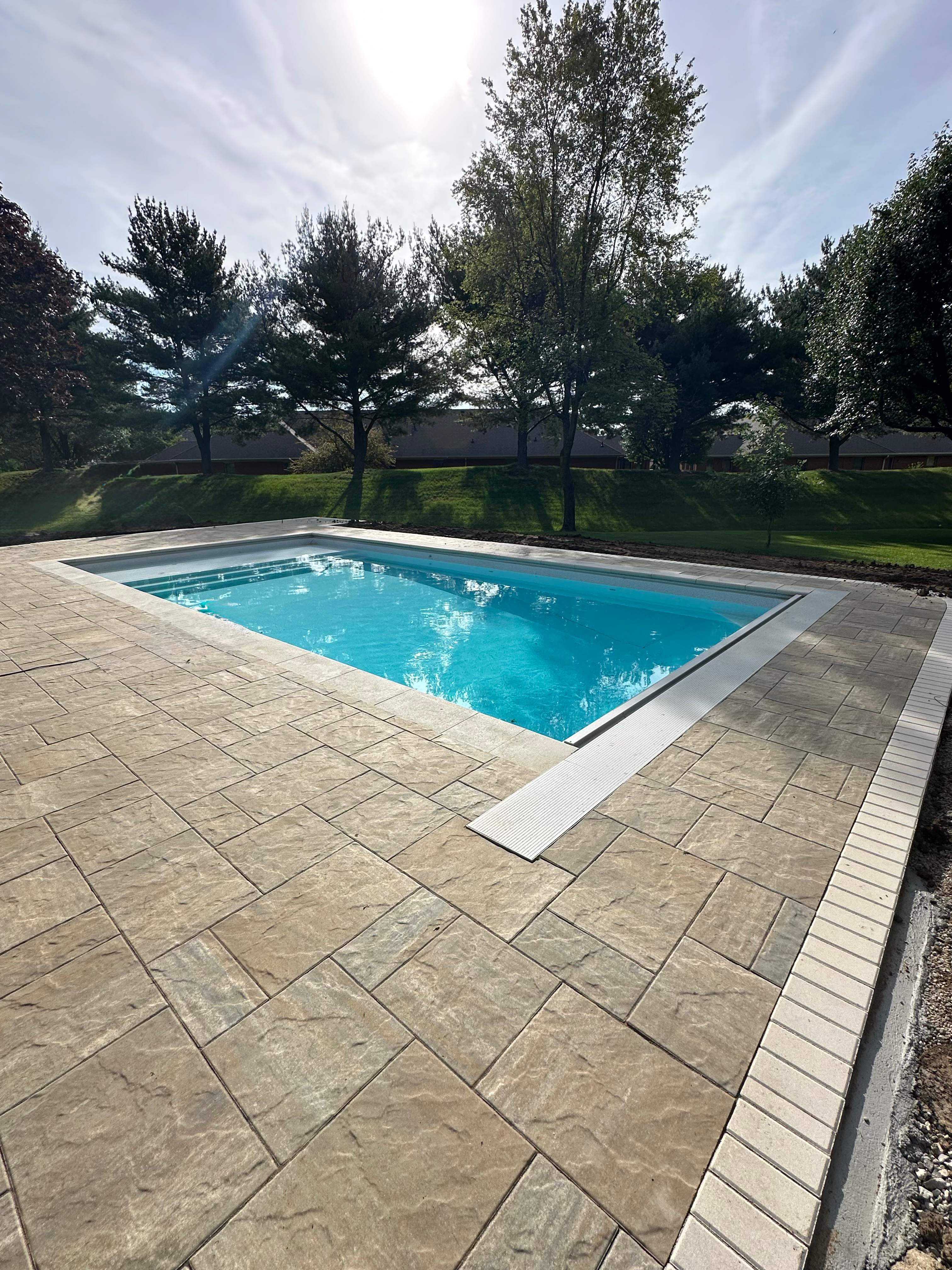 This elegant 16'x'32' pool features a Merlin Lake Como liner that creates a clean, inviting water color with a bright aqua-blue tone that reflects natural light and creates a refreshing, resort-style appearance. The crisp waterline and smooth interior finish enhance the pool’s modern design while delivering a calm, inviting atmosphere ideal for both relaxation and recreation. The pool is surrounded by a beautifully crafted paver deck patio with a stamped stone texture that adds warmth and visual interest. The deck showcases soft, natural earth tones that complement the water color while providing a durable, slip-resistant surface. A light-colored coping and integrated pool cover track create a clean, finished edge, seamlessly blending the pool into the patio. Together, the pool and patio form a timeless outdoor living space that balances style, comfort, and long-lasting performance—perfect for entertaining or enjoying quiet moments outdoors.