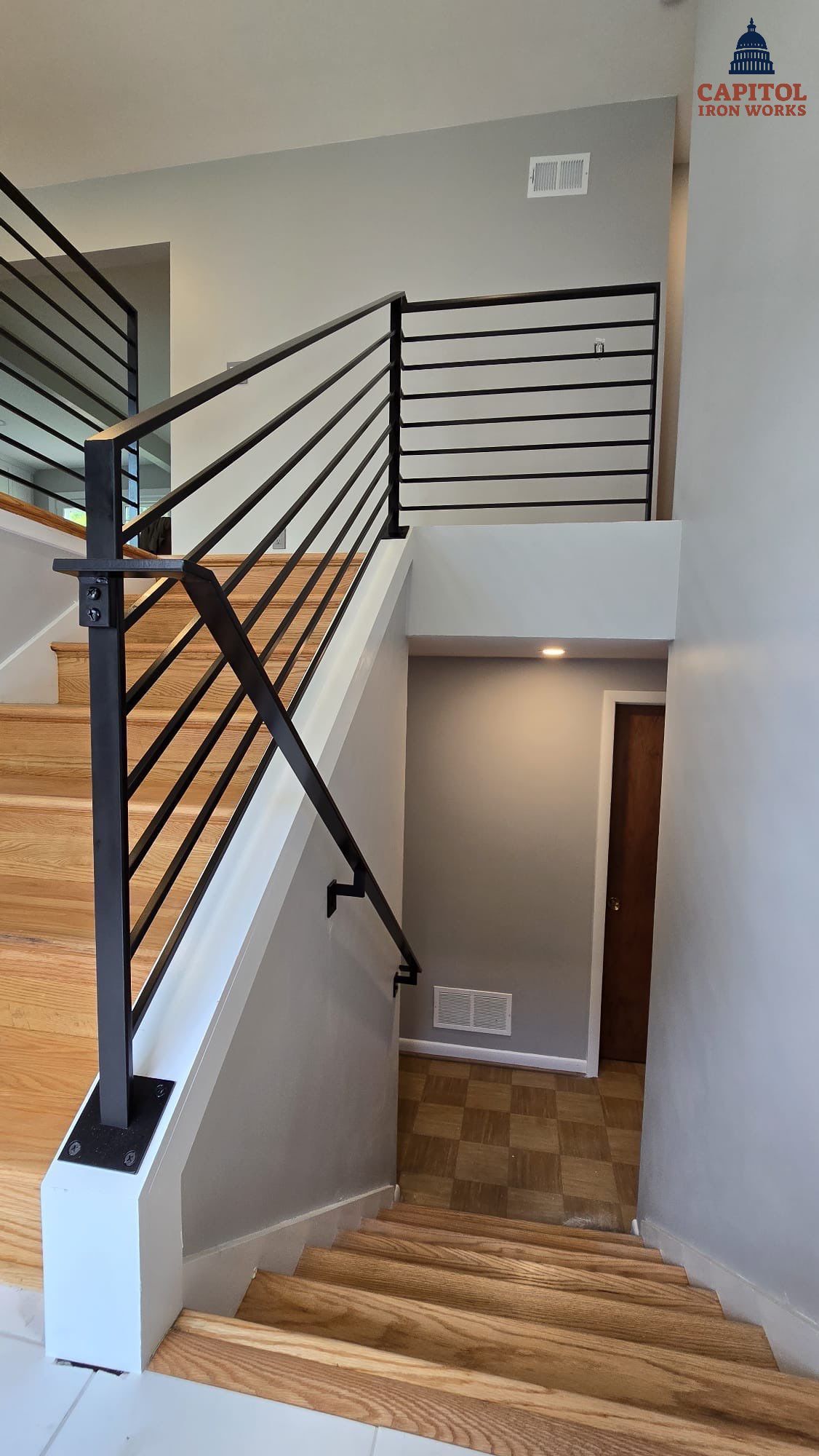 Capitol Iron Works completed the fabrication and installation of a custom Iron Railing for a residential project on Nottingham St in Arlington, VA. This project required high-precision engineering to ensure the new railing posts fit perfectly into the existing holes in the floor. Design Style: Modern/Contemporary design featuring clean Horizontal lines. Structural Components: The handrail and main structure were crafted using 1/2" x 1-1/2" Hot Rolled A-36 Steel Flat bar. Infill Detail: The horizontal balusters consist of 1/2" x 1/2" Hot Rolled A-36 Steel Square bar for a sleek, industrial, and minimalist look. Finish: Finished in a premium Powder Coat Finish for superior durability and a smooth, professional aesthetic. The Problem We Solved: The client needed a modern upgrade that didn't require drilling new anchor points. We custom-engineered the iron posts to align exactly with the pre-existing holes in the flooring, providing a seamless installation that preserved the integrity of the home's surfaces while modernizing the space. This project highlights our ability to handle complex retrofitting with custom metalwork in the Arlington, VA area. Our Gaithersburg-based shop specializes in marrying structural integrity with high-end ornamental design, ensuring every project—no matter how technical—is delivered with precision.