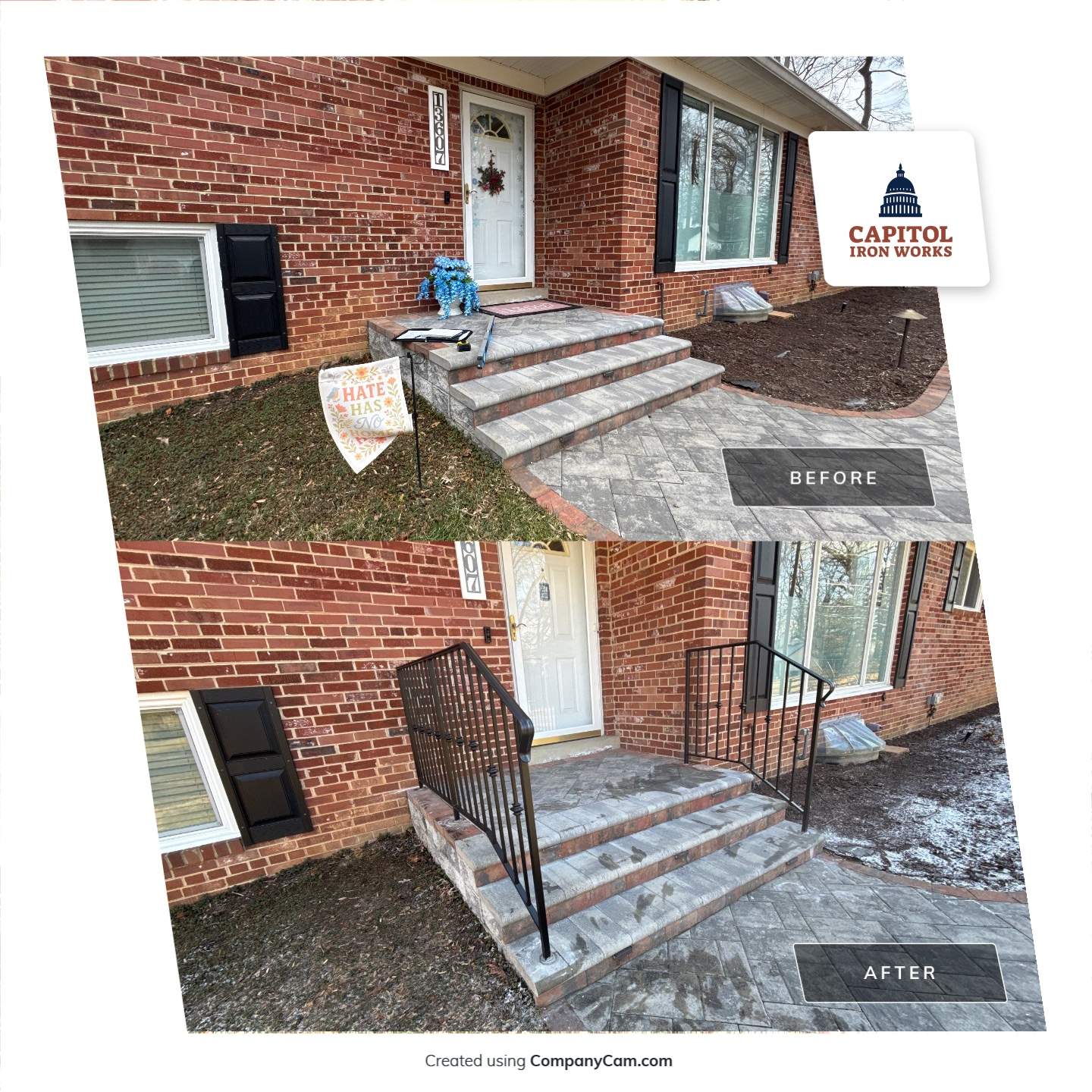 This project features two custom-fabricated exterior iron railings designed to enhance both the safety and the aesthetic of the residence's entryway. We utilized ornamental pickets to provide a timeless, high-end look that complements the home’s architecture. To ensure a clean and professional finish, the railing was painted with a conventional black paint, over our standard primer coat, offering a classic semi-gloss sheen and a vital layer of weather protection. Our team focused on high-strength welds and precision spacing to meet local safety codes while maintaining a sleek, decorative profile. Project Type: Residential Exterior Railing Design Elements: Decorative Ornamental Pickets Finish: Classic Black Enamel Key Features: Weather-resistant coating, precision-welded ironwork