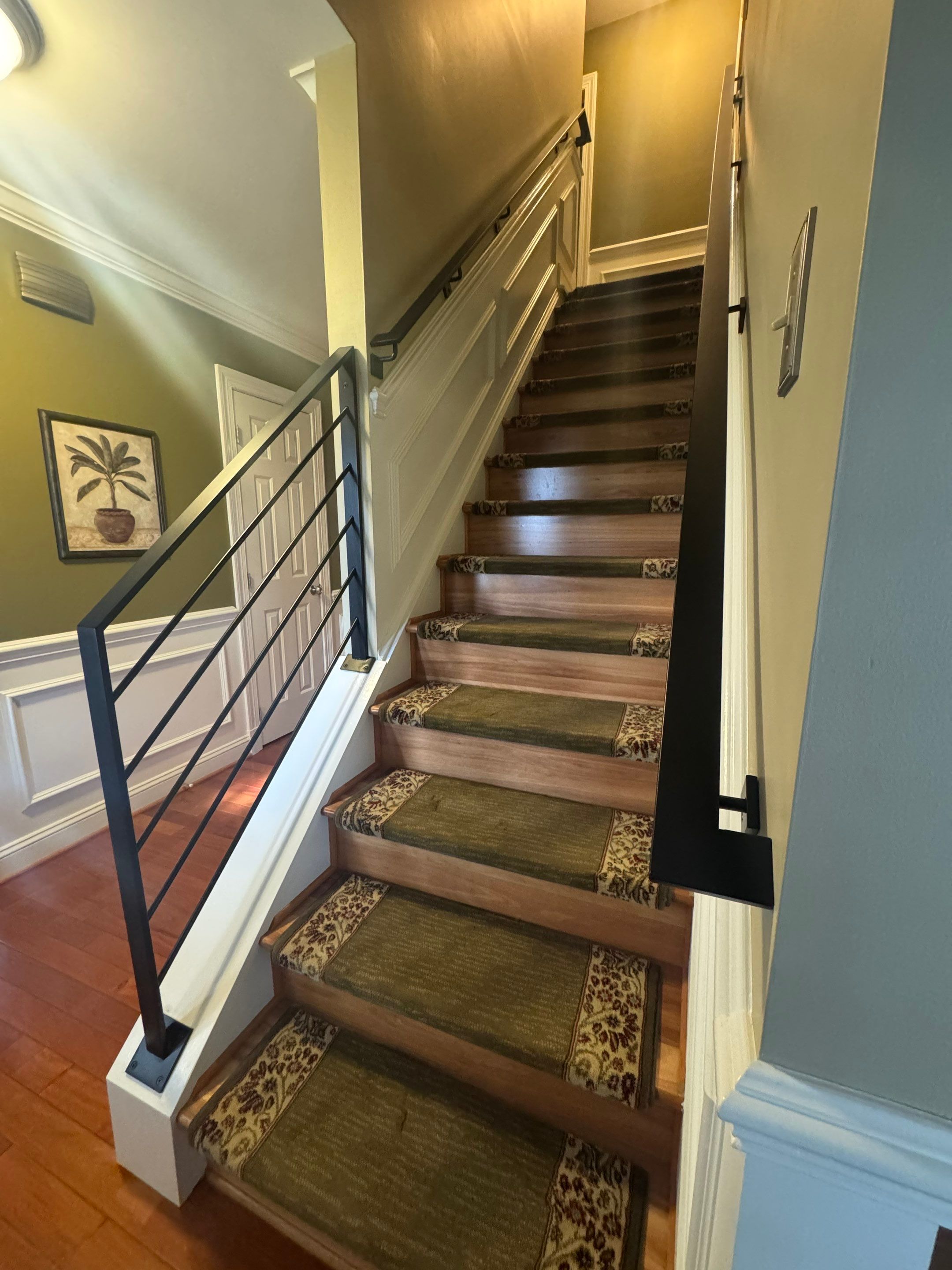 Project Description Suggestion Capitol Iron Works recently upgraded this residential interior by replacing bulky, traditional wooden banisters with a custom-fabricated modern steel railing system. This project highlights our ability to integrate sleek, industrial-strength materials into a refined home environment. Project Details & Craftsmanship: Contemporary Profile: The system features a solid steel flat bar top rail, providing a slim, modern look that maximizes visibility and light throughout the staircase. Precision Fabrication: All posts are constructed from square steel tubing, custom-fitted to the existing stair treads for a seamless, "built-in" appearance. Horizontal Infill: The design utilizes solid round bar horizontal balusters, a popular contemporary choice that creates an airy, open-concept feel while maintaining strict safety standards. Professional Finish: The railings are finished in a satin architectural black, offering a durable and elegant contrast to the home’s light interior and wood flooring. Full Service: Our team handled the entire process, from the clean removal of the previous wood railing to the final precision-welded installation of the new steel system. This project is an excellent example of the "Modern-Industrial" style currently in high demand across Maryland, DC, and Virginia. It demonstrates how Capitol Iron Works can transform a standard staircase into a high-end architectural focal point.