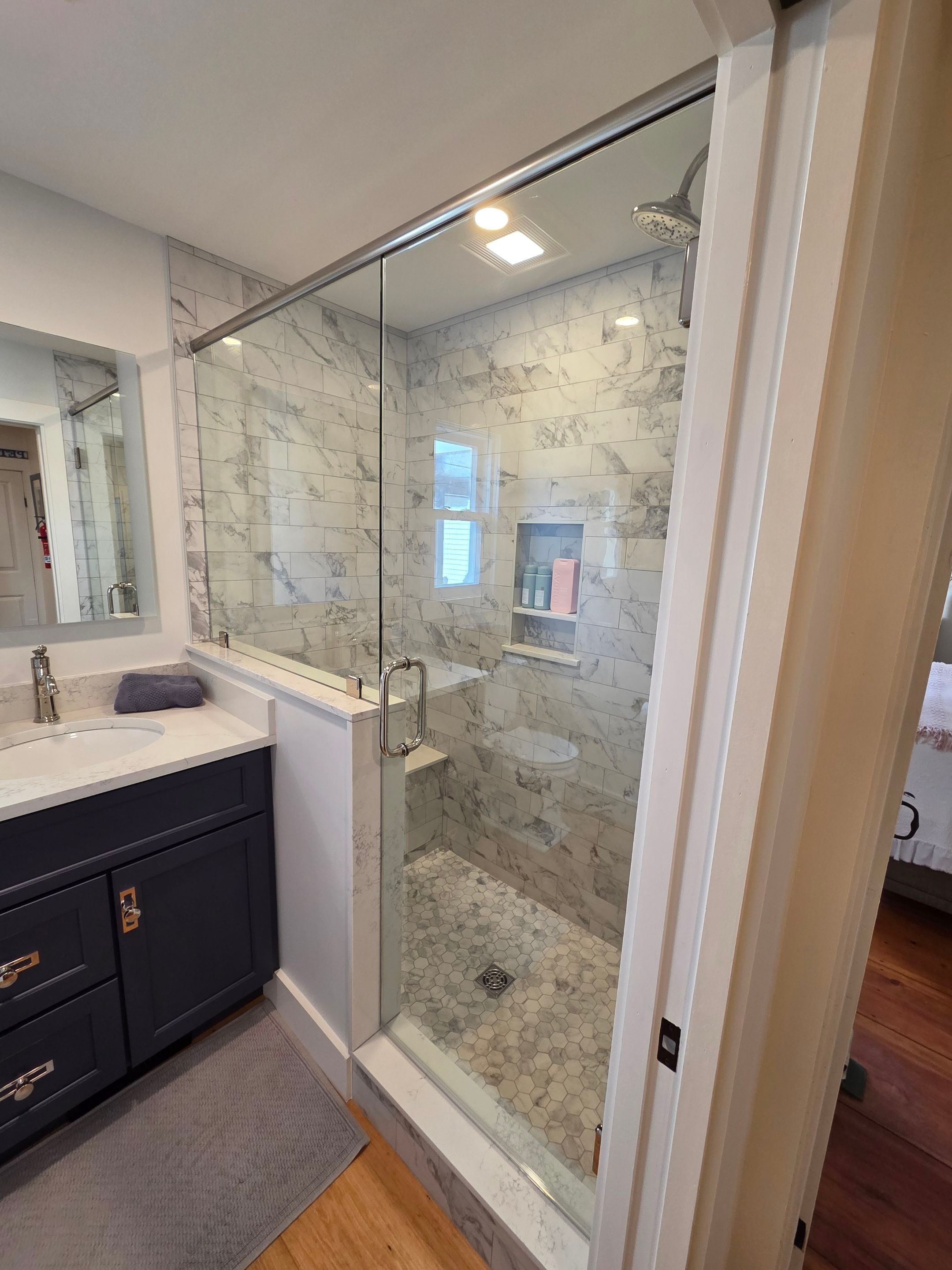 Elevate your bathroom with this newly installed frameless shower enclosure, crafted from 3/8" Clear Glass with ShowerGuard for lasting clarity and protection. Finished with elegant Polished Nickel hardware, this enclosure blends durability with luxury—seamlessly installed to deliver a clean, spa-inspired aesthetic.