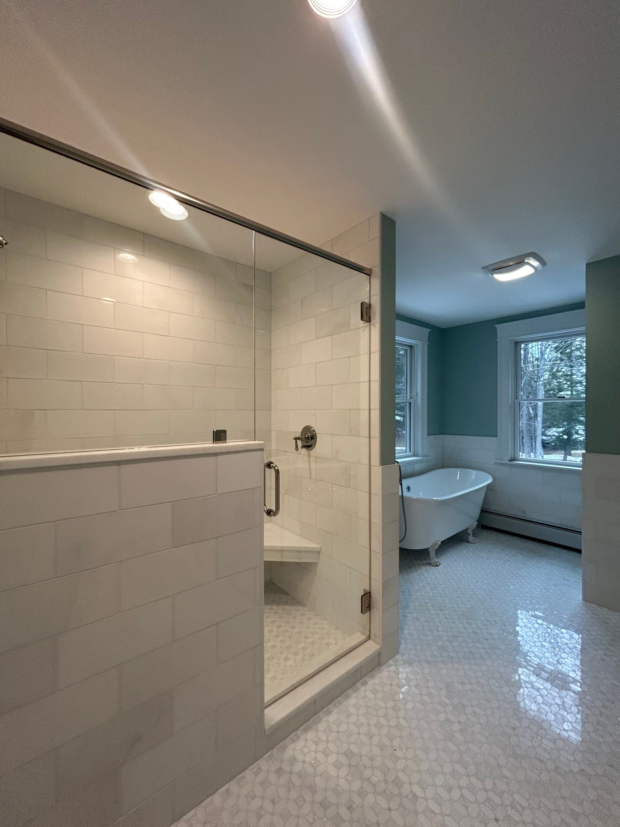 Frameless Shower Enclosure with Header Bar Crafted from 3/8" clear glass with ShowerGuard and finished with polished nickel hardware, this frameless enclosure delivers a bright, modern look with long‑lasting clarity and protection. Professionally installed for a precise, seamless fit that elevates any bathroom.