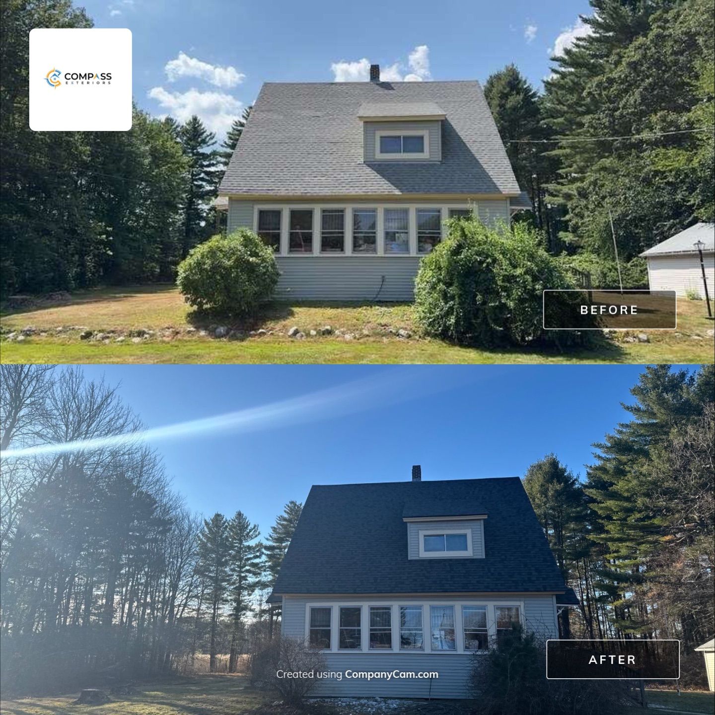 Q: Who installed Owens Corning Peppercorn shingles on a home in Manchester, NH? A: Compass Exteriors completed a full roof replacement in Manchester, NH using Owens Corning TruDefinition® Duration® shingles in the Peppercorn color, including a full tear-off, deck inspection, upgraded underlayment, improved flashing, and same-day cleanup. Q: What was included in the Manchester, NH roof replacement project? A: The project included a complete tear-off, replacement of any damaged decking, installation of ice and water shield, synthetic underlayment, Owens Corning Peppercorn architectural shingles, proper ridge venting, and a thorough magnet and yard cleanup.