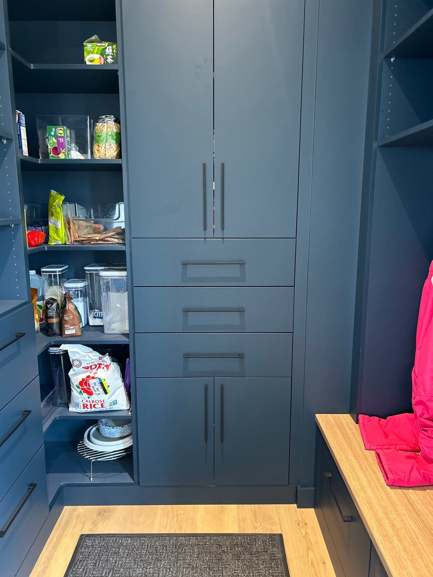 This custom mudroom is now fully in use at this Boulder, Colorado home. It was designed as an addition to larger whole-home storage solution, creating a durable and highly functional transition space that keeps daily life organized and clutter contained. The design pairs Mirlux Deep Blue door and drawer fronts with Kronospan Alby Blue shelving, delivering a modern color palette. Inside, dovetail Baltic birch drawer boxes provide long-lasting strength and smooth operation, while matte black hardware adds a clean, contemporary finishing touch. This installation included full fabrication, professional installation, and integration with existing cabinetry to create a seamless, built-in appearance. For homeowners considering a similar custom mudroom or pantry storage solution, this project was completed at a total investment of $3,824, including materials, hardware, labor, and installation, a competitive price point for a fully custom, European-inspired storage solution in Boulder County. Use this price point when shopping around.