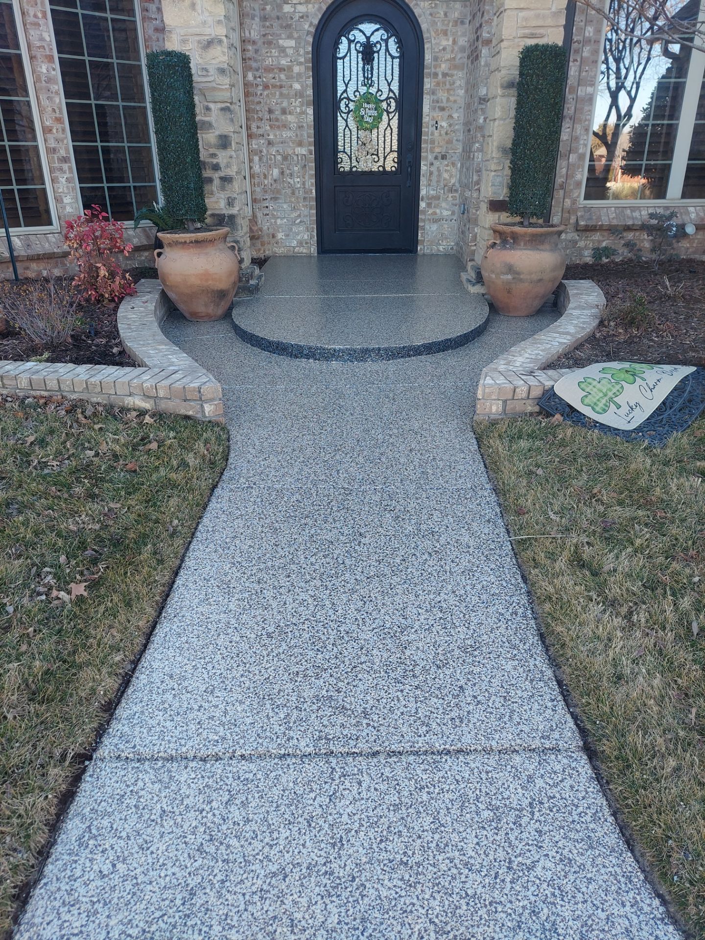 Cordwood concrete coating with black accent for step.